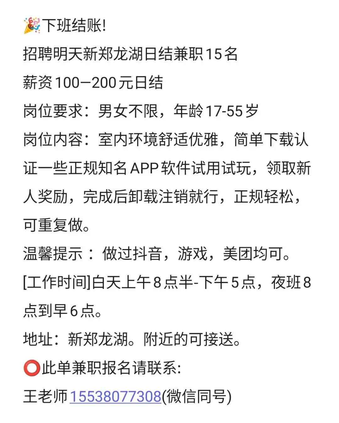 ⭕平台薪资紧跟市场最高价,如果你在外边看到有价格高的,带截图私聊客服跟价,我们会竭力为大家争取公平公正!更多郑州日结、短期、全职、线上兼职,每天持续更新,如需及时获取最新通知,可以关注我们~