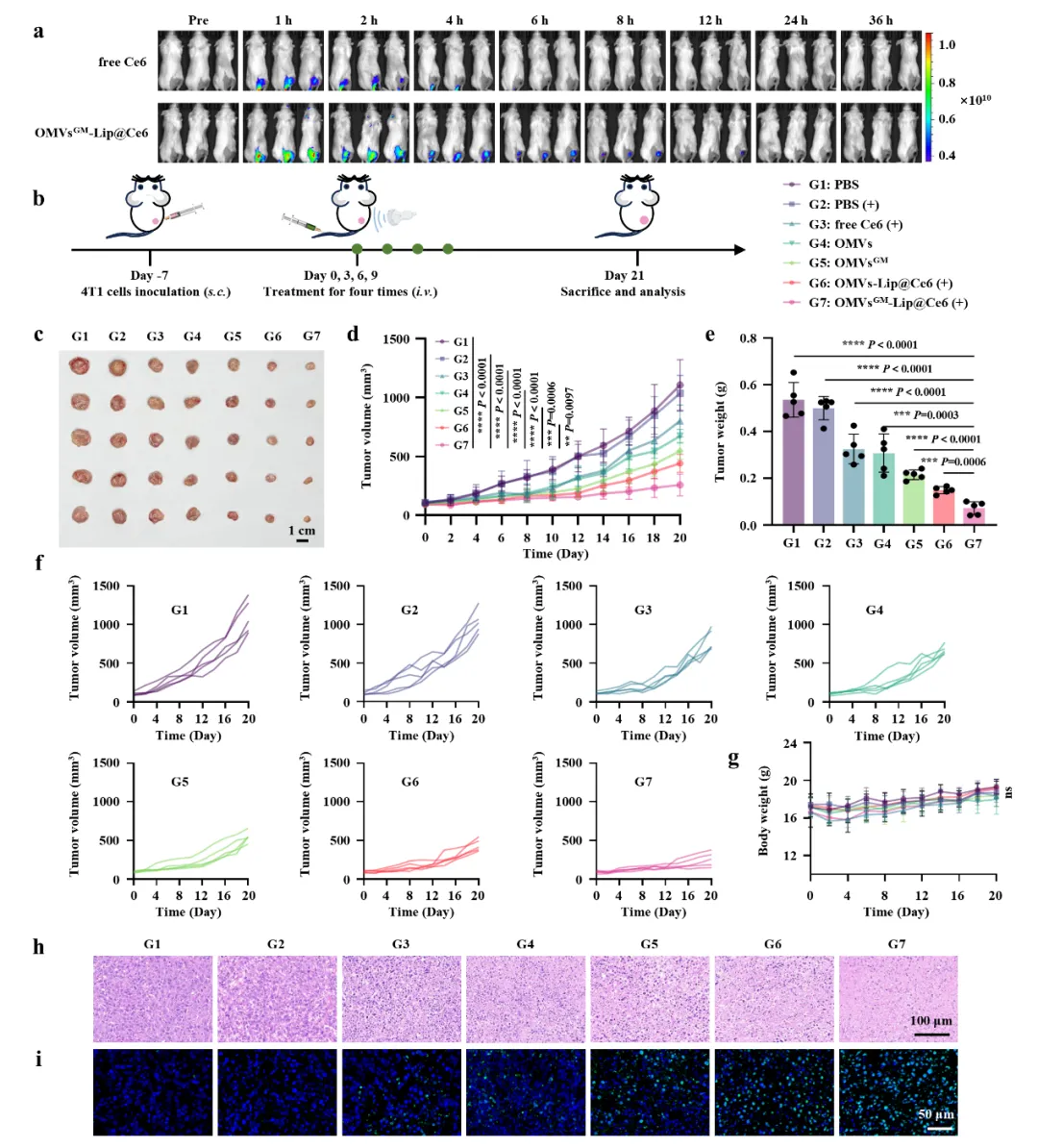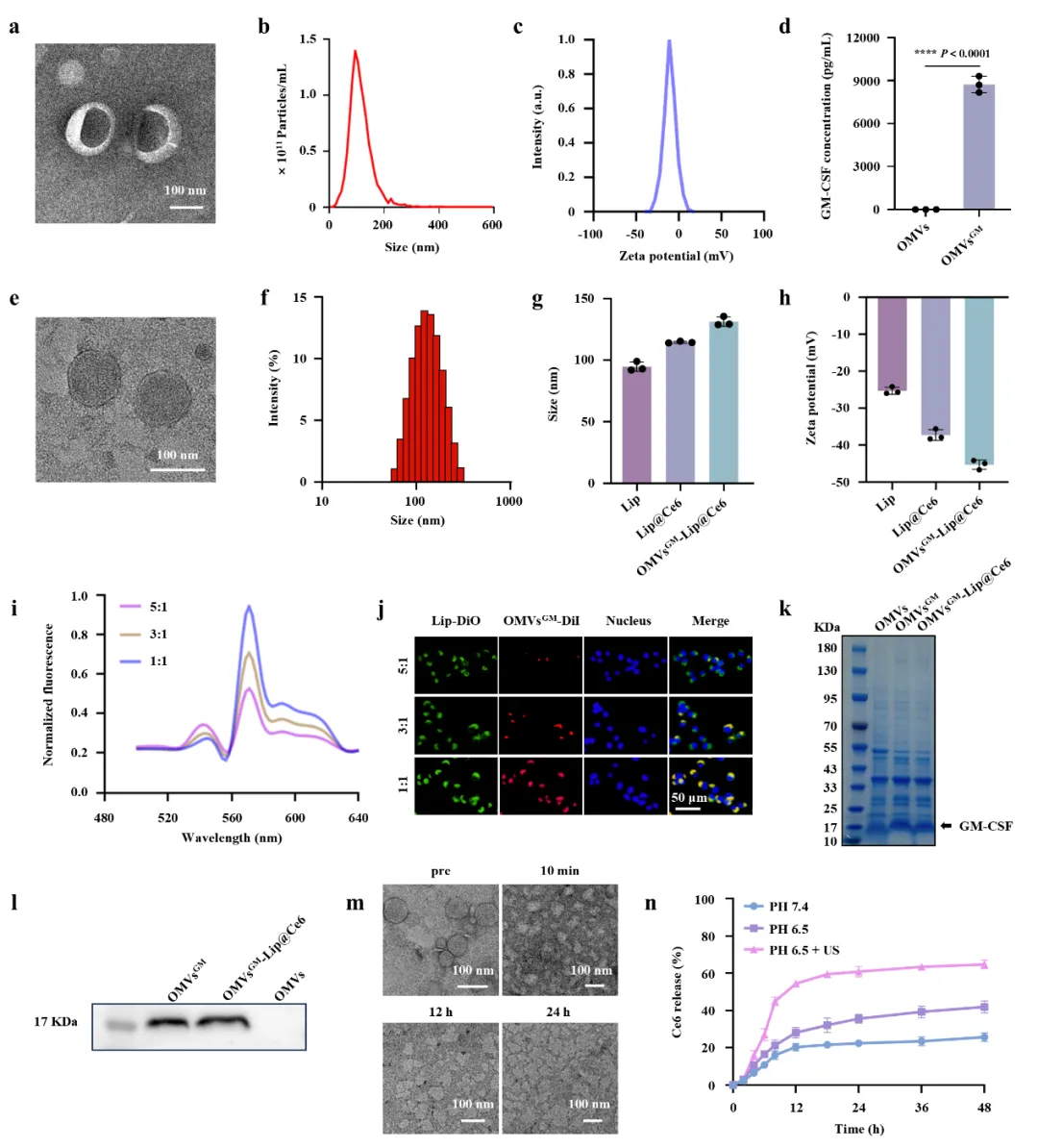 研究团队首先通过基因工程手段构建了稳定表达GM-CSF的重组大肠杆菌菌株,并提取所得OMVsᴳᴹ,经Western blot等方法验证GM-CSF在OMV中的成功装载与表达。随后,采用薄膜水化法制备负载Ce6的pH敏感脂质体,并通过连续挤出法与OMVsᴳᴹ融合,形成OMVsᴳᴹ-Lip@Ce6杂合纳米囊泡。