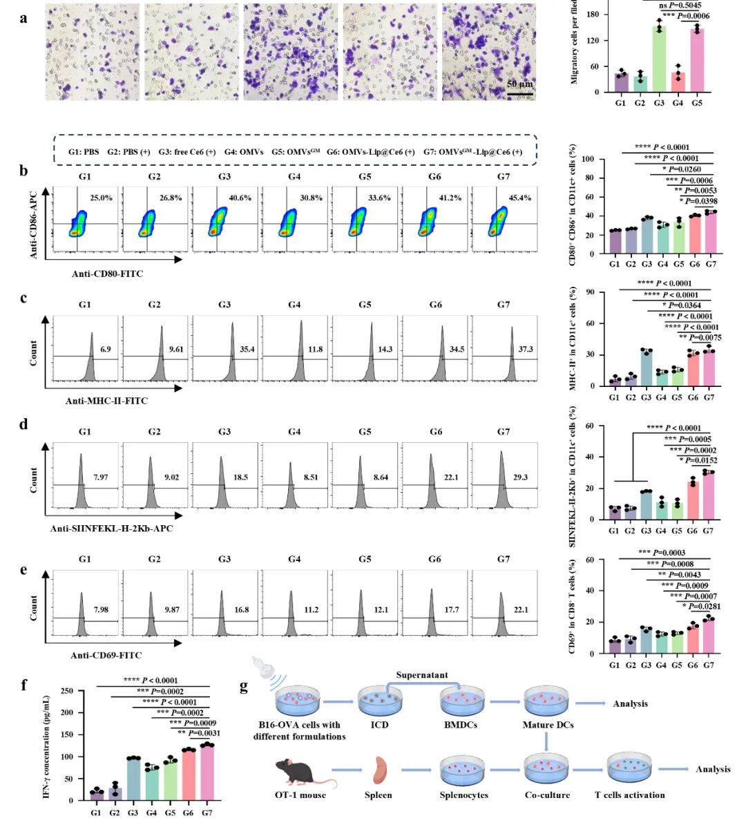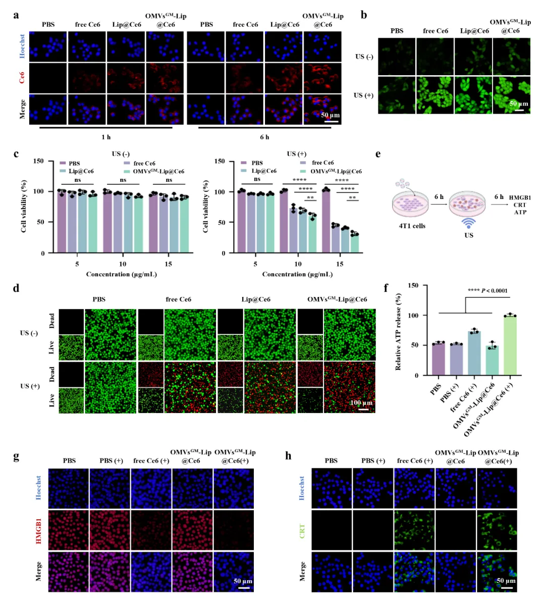 体外实验表明,OMVsᴳᴹ-Lip@Ce6可被4T1乳腺癌细胞高效内吞,超声照射后ROS水平显著提升,并有效诱导肿瘤细胞发生ICD效应。Transwell实验显示,OMVsᴳᴹ-Lip@Ce6将骨髓来源树突状细胞(BMDCs)的募集效率提升约3.3倍,并显著上调BMDC表面成熟标志物CD80、CD86及MHC-II的表达水平。更重要的是,经OMVsᴳᴹ-Lip@Ce6联合超声处理的肿瘤细胞上清液可促进BMDC对OVA抗原的交叉提呈,进而激活OT-1转基因小鼠来源的CD8+ T细胞,证实该平台具备启动抗原特异性细胞毒性免疫应答的能力。