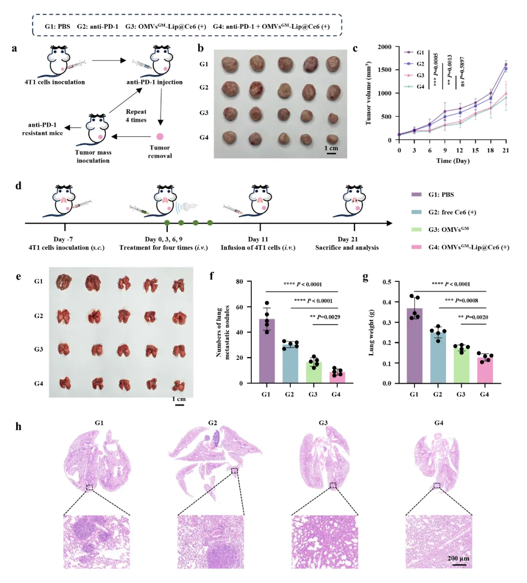 OMVsᴳᴹ-Lip@Ce6在抗PD-1耐药模型中的抑瘤效果及抑制转移作用