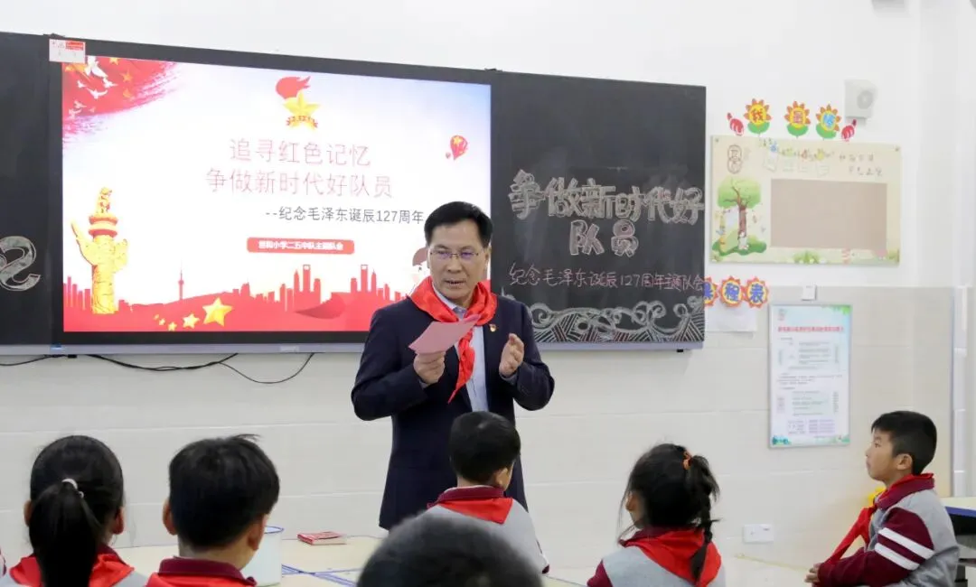 在纪念毛泽东同志诞辰127周年之际,经开区教文体局负责人走进经开区世和小学二五中队,以“追寻红色记忆争做新时代好少年”为主题,深入浅出地为少先队员讲授了一堂生动的思政课。该校全体师生通过网络直播的形式观看此次思政课。