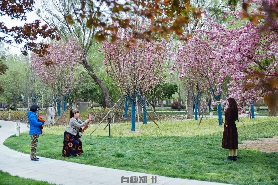 在郑州的古树苑公园的晚樱林里也是如此,有不少学生放学后背着沉甸甸的书包一屁股坐到樱花树下,周围散落着一地绯红的轻云。