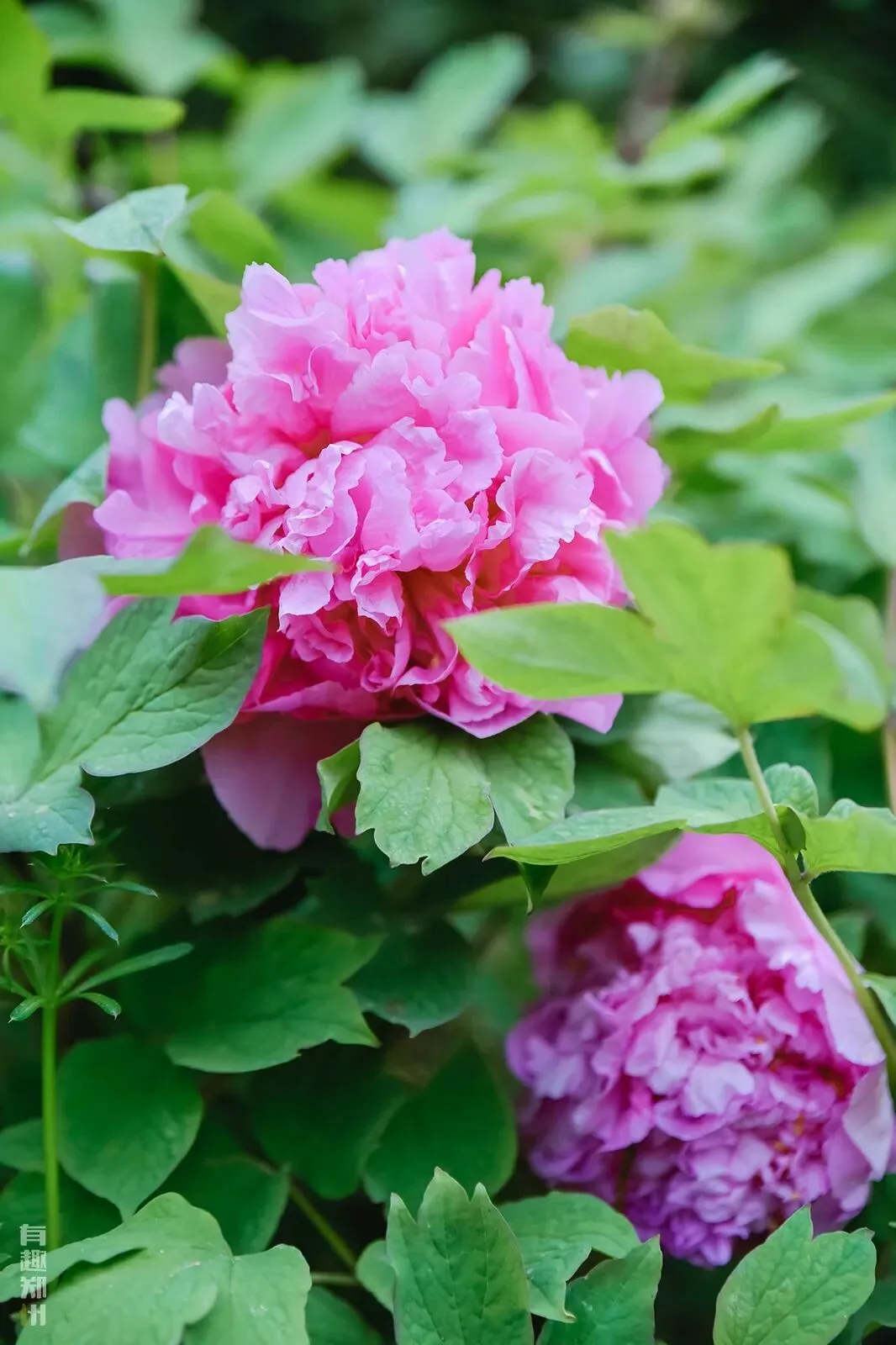阳光透过树叶、树干之间的缝隙洒下来,饱经风霜的古树与娇嫩美丽的牡丹之间遥相辉映,尽显芳华。