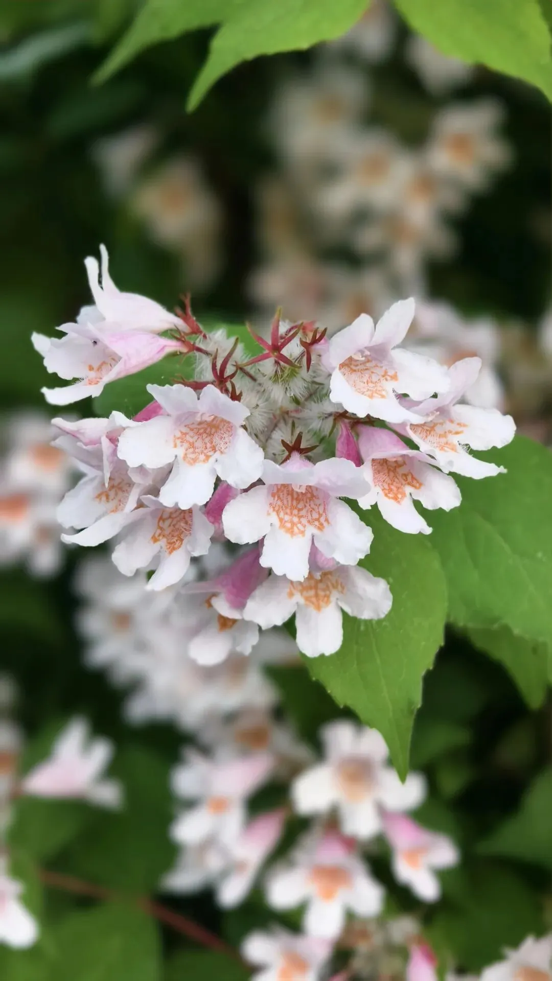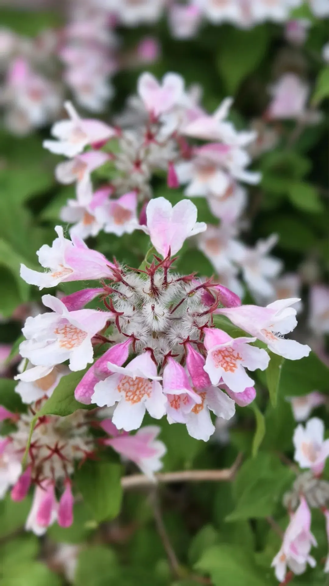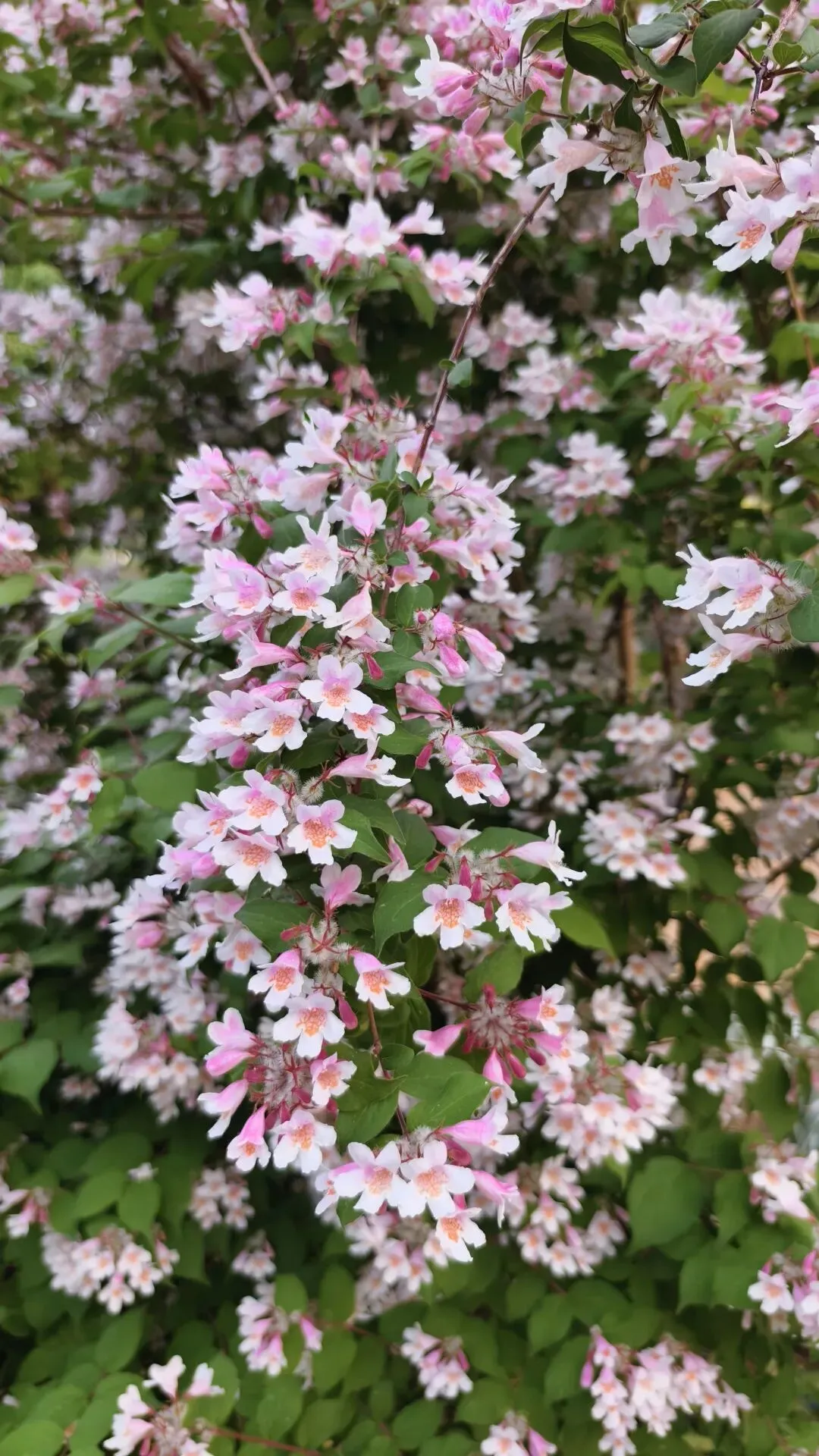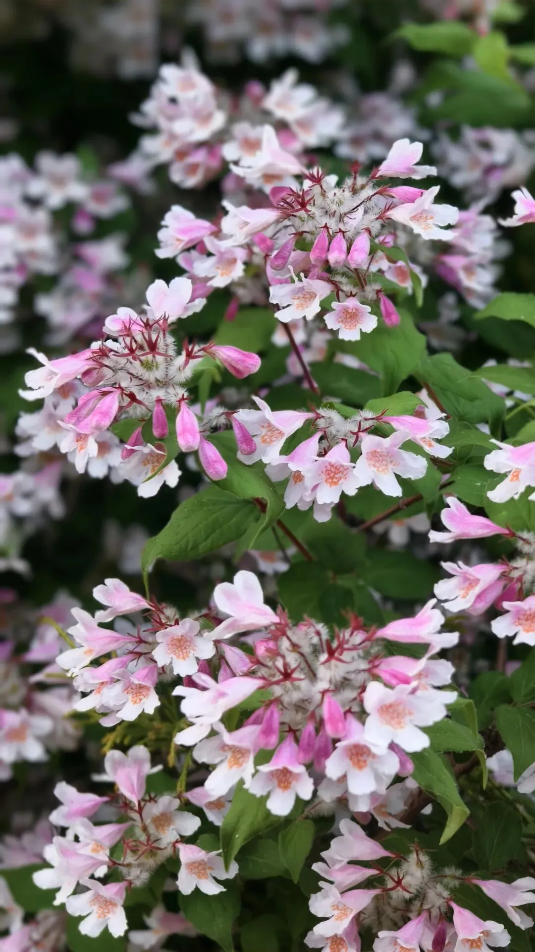 郑州植物园牡丹花基本都谢了,可这时路上花丛里猬实花盛开了,钟形小花密密匝匝,粉白、淡绯、柔紫交织,缀满翠枝,如云锦垂落,似风铃轻唱。