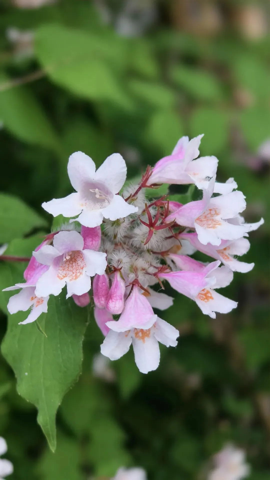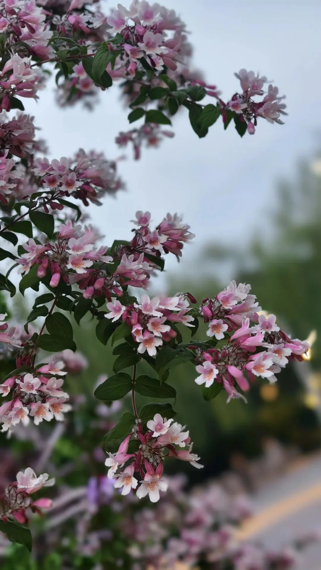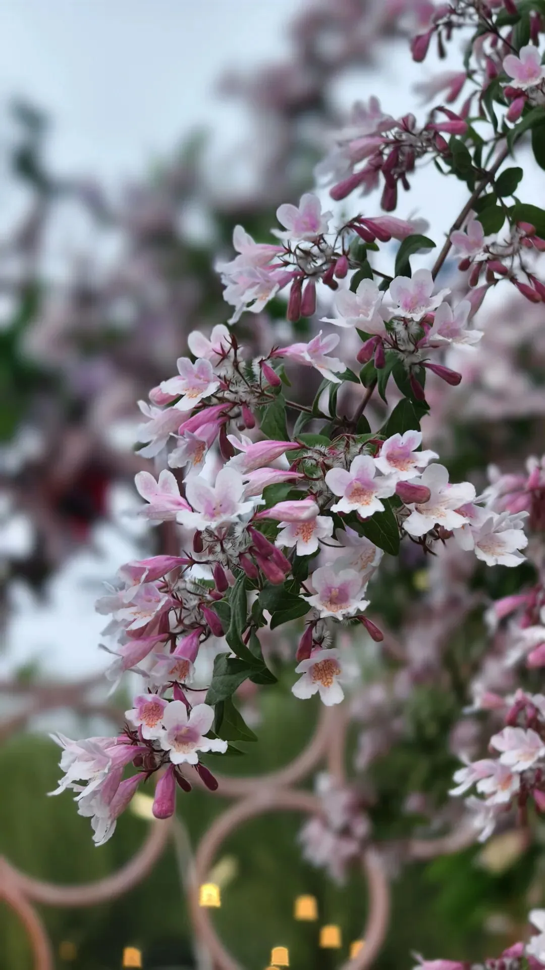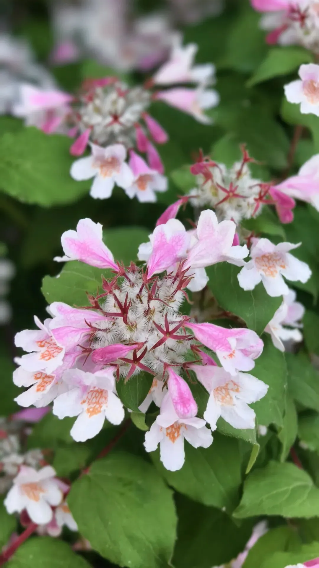 郑州植物园牡丹花基本都谢了,可这时路上花丛里猬实花盛开了,钟形小花密密匝匝,粉白、淡绯、柔紫交织,缀满翠枝,如云锦垂落,似风铃轻唱。