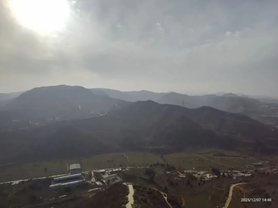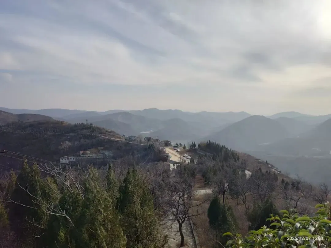 千尺塔,或者说它所在的大周山(如今也叫塔山),有一种独特的魅力——四时景不同,各有各的看头。春天的大周山,是属于杏花的。漫山遍野的野杏花竞相绽放,远远望去银白似雪,如同一片花的海洋。粉白的花海与苍劲古朴的千尺塔交相辉映,古塔掩映在花丛之中,是摄影爱好者绝不容错过的画面。夏日的大周山,是一处难得的清凉秘境。山峦起伏,林木蓊郁,满眼皆是深深浅浅的绿。站在山顶,山风穿林而过,带走一身的燥热。这时候来,最适合寻一处树荫,远远地望着古塔发呆。秋天的大周山,草木渐渐染上金黄与赭红。天高云淡,塔身青砖的纹理在斜阳下格外分明。山脚下的村落、田地和远方的山影,层层叠叠,像一幅淡墨写意的山水画。登山半道远望停车场