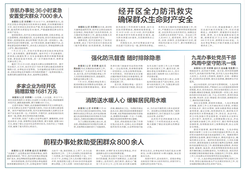连日来,面对特大暴雨造成的灾害,经开区立即启动防汛应急响应,各级各部门全员在岗待命,全力做好防汛减灾工作,避免出现重大灾情,保障人民群众生命及财产安全。强降雨前,经开区就制订了防汛应急预案,成立了经开区综合行政执法局(城市管理局)防汛指挥部,负责城区防汛抢险工作的指挥与调度,执行全区防汛管理要求,精细到每条街道。7月18日18时~21日14时,经开区路面积水最多时平均积水深度80厘米,最大积水深度220厘米,目前路面积水已基本退去。汛情发生后,经开区管委会班子成员迅速下沉到分包一线,指导各办事处、各单位全力做好防汛抢险救援工作,同时,严格落实24小时领导带班和值班制度,全区各单位全员在岗在位,保障全区人民群众生命和财产安全。共出动工作人员8811人,使用泵机、泵车、铲车、钩机、水泵、冲锋舟、应急机械927台次,使用防汛沙袋16万余个,累计转移群众近8000人。7月21日后,雨量逐渐减少,经开区迅速开展灾后恢复工作,对区内道路泥土、枯枝树叶、堵塞窨井垃圾进行清掏、清理,全力恢复道路及绿化面貌,清理淤泥37万立方米、冲洗道路200万平方米、清理积水600余处。九龙办事处等地已开始开展重点区域消毒消杀工作。一方有难,八方支援。昨日下午,来自全国各地的21家爱心企业和31位爱心市民,奔波驰援郑州经开区,踊跃捐款捐物,累计捐赠1681万元。记者在现场了解到,此次强暴雨导致经开区大面积受灾,2万余名群众生命财产受到重大损失,7000余名群众紧急转移。面对严峻的防汛形势,经开区始终把保障人民群众生命财产安全放在第一位,不讲条件、不惜代价、昼夜奋战在防汛救灾一线,抓细、抓实各项防汛救灾措施。面对灾情,全国广大爱心企业伸出援手、慷慨相助,纷纷送去雨衣、沙袋、食物等应急救灾物资,累计捐款、捐物1681万元,彰显了爱心企业对社会的责任担当,为经开区上下战胜灾害,凝聚了强大的信心和动力。为扎实做好防汛减灾工作,保障辖区广大居民的生命财产安全,连日来,经开区明湖办事处工作人员持续加强辖区防汛、抢险减灾、转移受灾群众等工作。7月19日,明湖办事处负责人就来到辖区防汛物资仓库现场,详细查看防汛物资储备情况。要求各责任部门准备好充足的防汛物资,一旦出现汛情,各类物资要第一时间到位,以免出现物资短缺、不全的情况。同时要求社区安置点随时做好汛情应对准备情况,密切关注天气变化,随时做好隐患点汛情监测工作。连日来,明湖办事处一直实行汛期24小时值班值守制度,各社区及有关部门安排工作人员不间断参与防汛救灾工作,截至目前,明湖办事处共转移群众393人,其中建业总部工地转移150人到行知小学妥善安置。明湖办事处负责人表示,办事处将时刻注意天气变化情况,全员参与防汛救灾工作,为辖区群众的生命财产安全保驾护航。7月20日下午,雨势骤然加大,经开区京航办事处辖区内东风渠水位暴涨,河水倒灌导致石王村、吴庄村居民生活区积水严重,积水最深处达到两米多深,最浅的积水深度也有60厘米,严重威胁辖区群众的生命财产安全。接到险情后,经开区立即启动紧急预案,京航办事处、区应急管理局、消防救援大队、社会事业局、综合行政执法局(城管局)、投资促进局、派出所等部门负责人第一时间深入一线,组织村民进行转移安置。由于积水较深,普通车辆进不去,办事处紧急组织多辆铲车,涉水进入居民区内,带领受困群众登上铲车,撤出危险地带。7月21日上午,在经开区管委会和京航办事处的协助下,蓝天救援队、菠萝救援队、亳州市红十字会救援队、济南南山救援队等11支专业救援队携带冲锋艇等救援设备,紧急赶赴受灾现场,进一步开展防汛救灾、转移受灾群众的工作。截至7月21日23时,该受灾点群众全部转移完毕。据不完全统计,石王村、吴庄村总计7000多名群众被成功转移至瑞绣小区、办事处会议室等地。为尽量满足受灾群众生活需求,京航办事处还在瑞绣小学内临时搭建了一处简易安置点,免费向群众提供军被、热水、泡面等应急物资。“太感谢了,这些都是我们的救命物品,真的感谢党和政府。”昨日,经开区前程办事处领到矿泉水、面包等物资的受困群众激动地说。面对洪涝险情,经开区前程办事处提前周密部署安排防汛工作,办事处领导干部带头驻守一线,靠前指挥,以上率下,全力以赴做好防汛工作。工作人员虽然已经连续作战三天两夜,但干起活来依然精力十足。7月21日下午,办事处工作人员对整个辖区进行巡查,发现前程大道上有800余名外地受困群众滞留,工作人员第一时间为他们送去20箱方便面、30箱矿泉水及面包等食品,并对受困群众进行分批次转移安置。“从来没见过城区下这么大的雨,感谢你们的救援,热水的不间断供应,让我们更加暖心,没有你们,我们真怕、真担心!”截至7月22日上午,已有300余名群众被转移至生活点,办事处再次为他们送去30箱面包、30箱方便面和10箱火腿肠,保证其基本生活。风雨中坚守,逆水流而行。前程办事处全体党员干部24小时在岗在位,时刻守护人民群众的生命财产安全。汛情就是命令,防汛刻不容缓。连日来,郑州持续强降雨天气,防汛救灾形势严峻,经开区九龙办事处坚持人民至上、生命至上的原则,根据市、区统一部署安排,启动防汛应急预案,强化应急措施,确保群众平安度汛。成立专班组织,实行扁平化管理