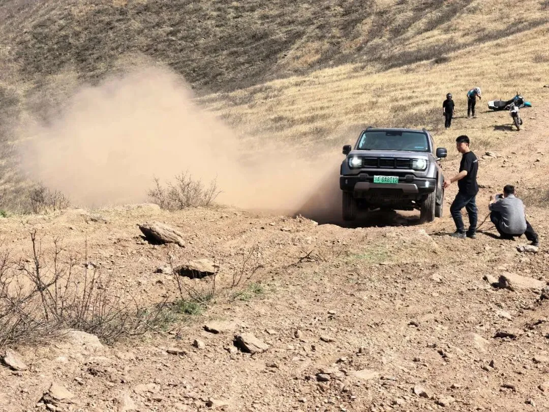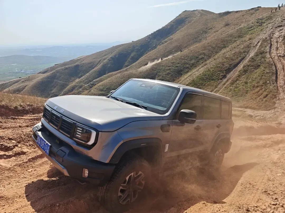 驶入越野路段,极限挑战接踵而至。面对陡峭险峻的好汉坡,BJ40 搭载 2.0T 高功率发动机迸发强劲扭矩,分时四驱快速切入 4L 模式,扭矩大幅放大,配合后桥电控差速锁,车轮牢牢紧抓砂石路面,稳步攀爬、顺利登顶。驶入大 V 沟,炮弹坑与陡坡交错,BJ40 凭借非承载式车身、230mm 最小离地间隙与 38° 接近角,从容应对车身扭曲与坑洼路况,透明底盘功能实时呈现车下路况,助力车主精准避障,平稳穿越这一中原险地。