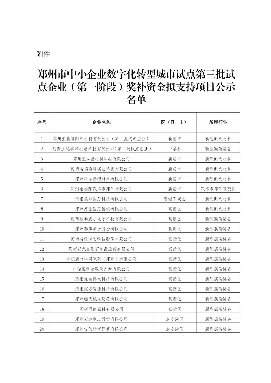关于郑州市中小企业数字化转型城市试点第三批试点企业(第一阶段)奖补资金拟支持项目的公示根据《郑州市中小企业数字化转型城市试点工作推进方案》(郑政办〔2024〕10号)、《郑州市中小企业数字化转型城市试点项目管理办法》(郑工信〔2024〕170号)、《郑州市工业和信息化局 郑州市财政局关于开展郑州市中小企业数字化转型城市试点项目第三批试点企业(第一阶段)奖补资金申报工作的通知》(郑工信企业〔2026〕18号)要求,经企业自愿申报、区县(市)初审推荐、市级初审、专家组评审、第三方审计等程序,现对申报郑州市中小企业数字化转型城市试点第三批试点企业(第一阶段)奖补资金的59个拟支持项目名单予以公示(见附件)。如有异议,请于公示期内以书面形式实名向郑州市工信局、郑州市财政局反映。公示时间:2026年4月21日至4月27日联系电话:郑州市工业和信息化局中小企业处 89895244郑州市工信局直属机关纪委 89895279郑州市财政局企业处 67181114 67175635附件:郑州市中小企业数字化转型城市试点第三批试点企业(第一阶段)奖补资金拟支持项目公示名单2026年4月21日附件_1:郑州市中小企业数字化转型城市试点第三批试点企业(第一阶段)奖补资金拟支持项目公示名单.wps
