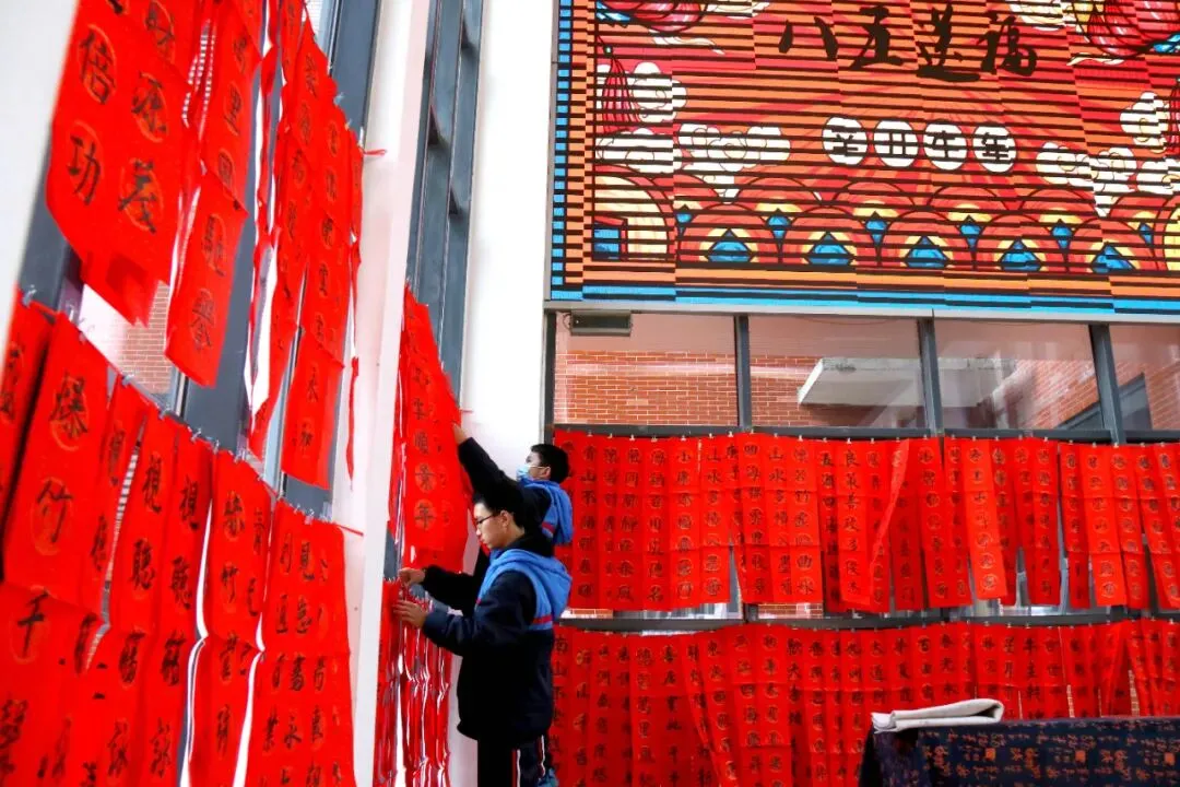 福赠新春祈平安,挥毫泼墨过大年。2月1日,郑州市第八十五中的一楼大厅被满墙的春联装点得红红火火,一派吉庆祥瑞景象,学校的几位“书法家”老师和校书法社团的孩子们受邀为全校师生现场书写春联,送上浓浓祝福。