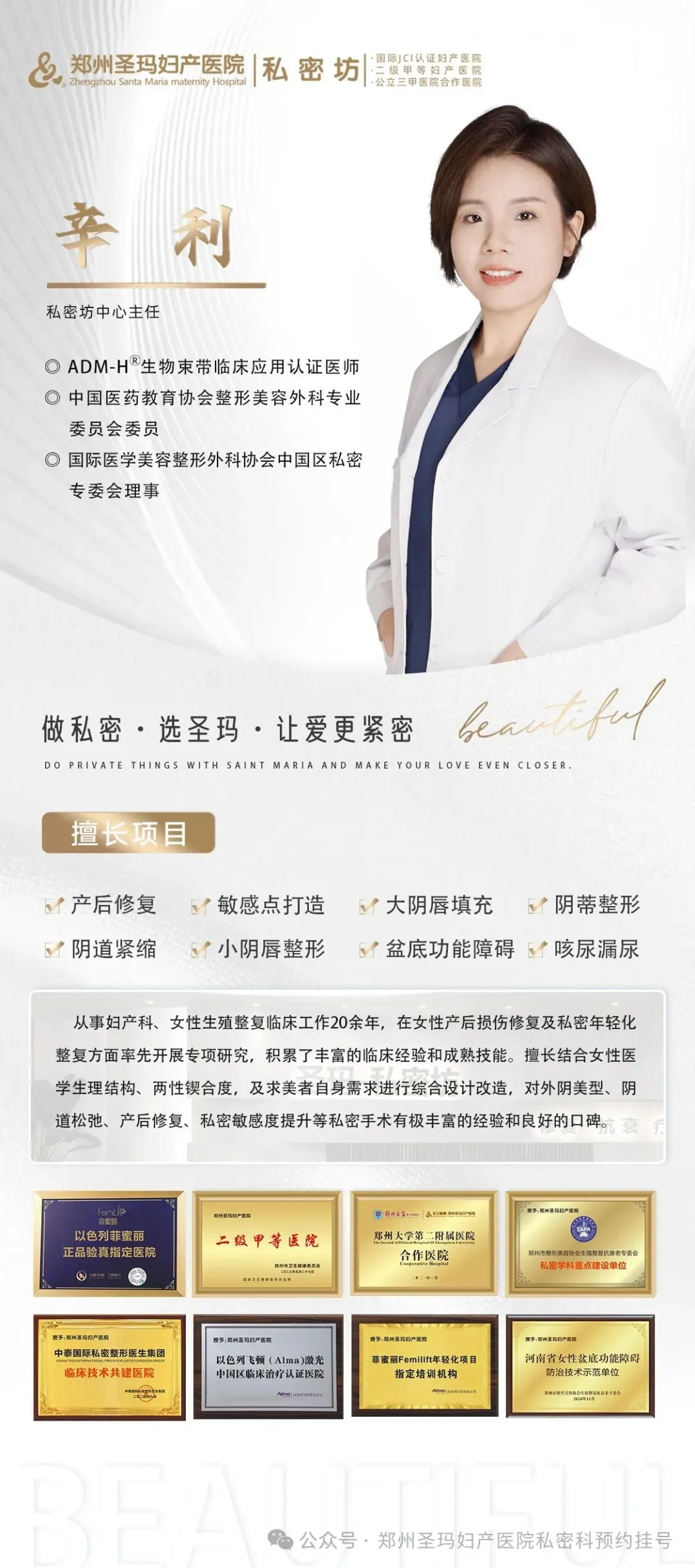郑州圣玛妇产医院 · 私密坊是融合医、教、研、创新医学模式的专业生殖整复医美中心,是拥有妇科+整形外科双资质的医疗级私密整复医美机构,全面开展私密整形、私密美化、私密抗衰维养、女性功能复健、盆底康复及高难度的生殖整形修复等高品质诊疗服务,始终与世界私密领域共振,领跑于整复行业前沿。