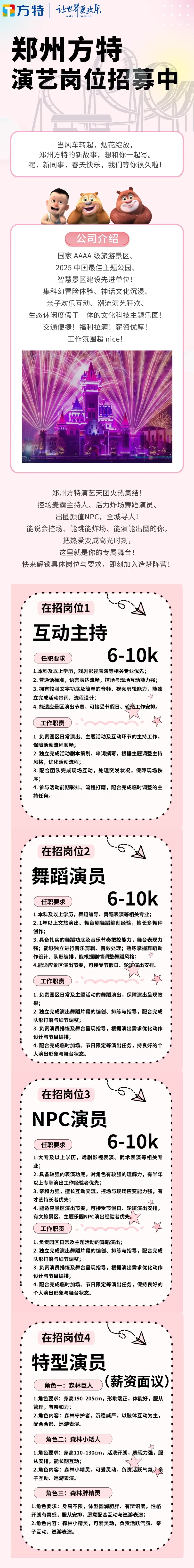 >4A级景区!郑州方特招聘工作人员!6-10k
