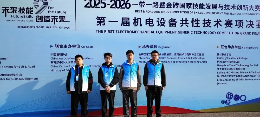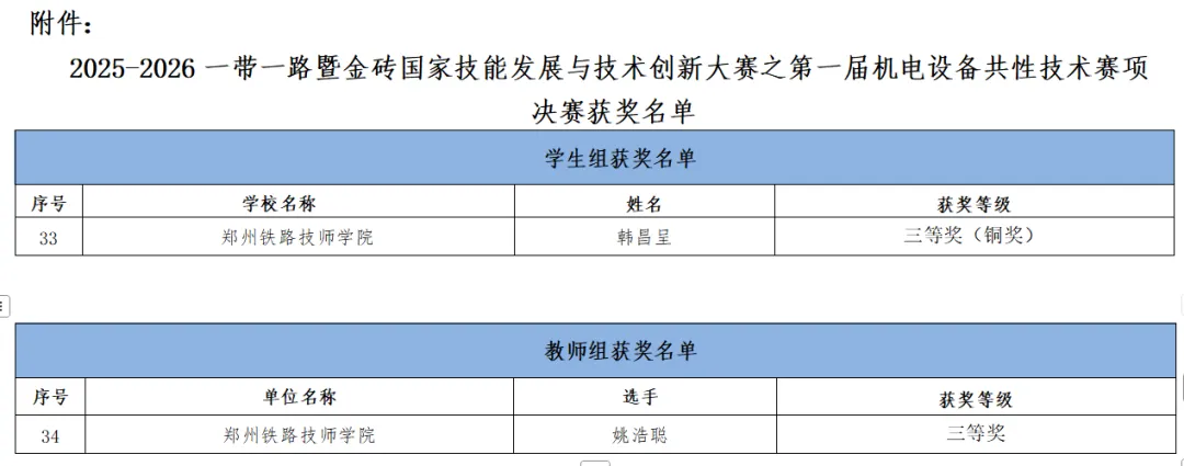 郑铁学院教师姚浩聪(右二)荣获2025-2026一带一路暨金砖国家技能发展与技术创新大赛第一届机电设备共性技术赛项全国决赛教师组三等奖;学生韩昌呈(右一)荣获学生组三等奖(铜奖)。