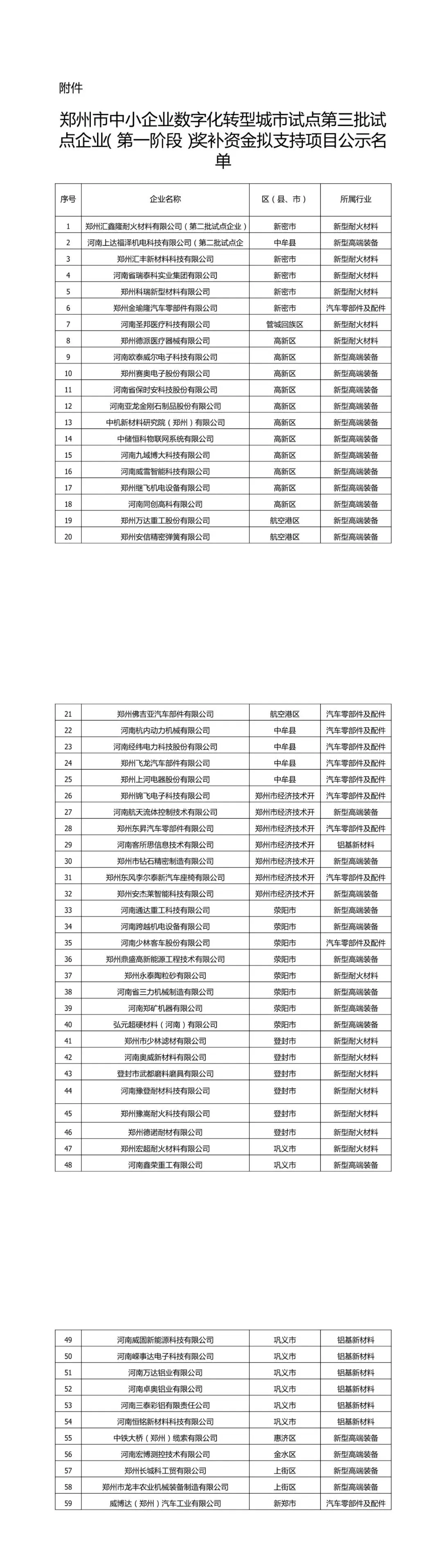 根据《郑州市中小企业数字化转型城市试点工作推进方案》(郑政办〔2024〕10号)、《郑州市中小企业数字化转型城市试点项目管理办法》(郑工信〔2024〕170号)、《郑州市工业和信息化局 郑州市财政局关于开展郑州市中小企业数字化转型城市试点项目第三批试点企业(第一阶段)奖补资金申报工作的通知》(郑工信企业〔2026〕18号)要求,经企业自愿申报、区县(市)初审推荐、市级初审、专家组评审、第三方审计等程序,现对申报郑州市中小企业数字化转型城市试点第三批试点企业(第一阶段)奖补资金的59个拟支持项目名单予以公示(见附件)。