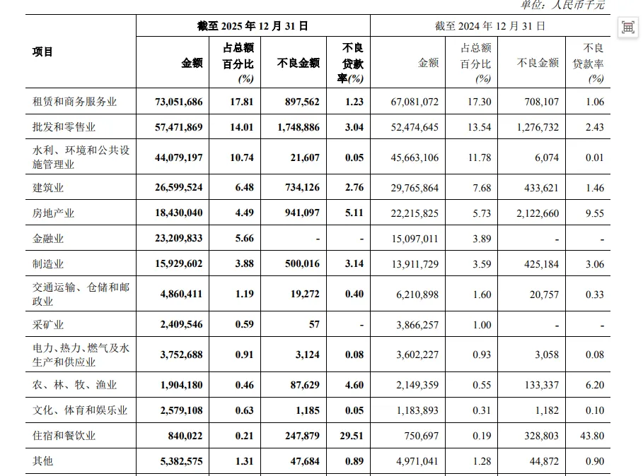 截至2025年末,该行的房地产、建筑开发、批发零售、制造业等这些传统产业不良率依然是居高不下。