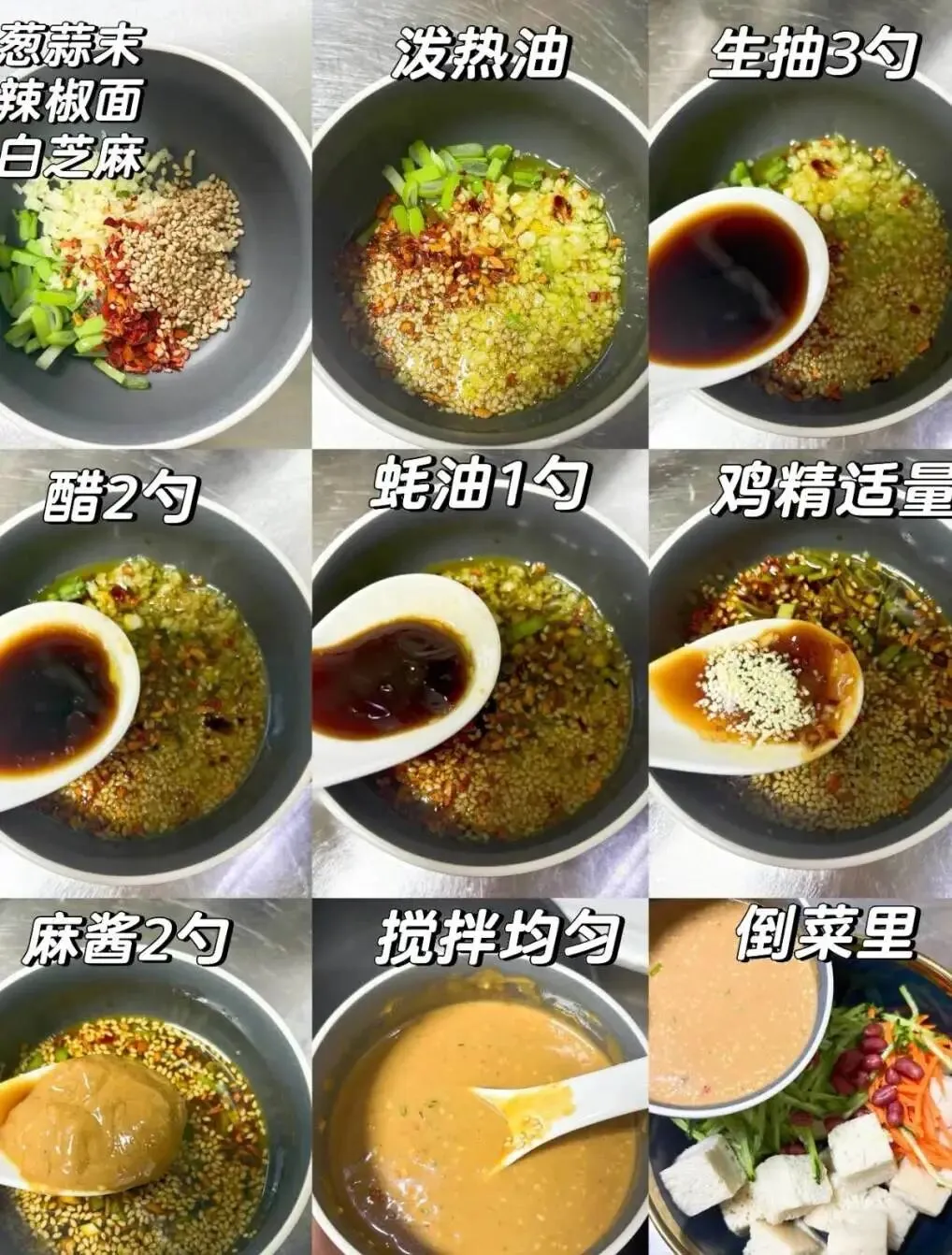 芝麻酱要用纯芝麻磨的,不能掺花生酱,否则香味不正。先用温水慢慢澥开,顺时针搅到顺滑,不能有疙瘩。然后加盐、糖、生抽、香醋、蒜水、香油,最后浇一勺红亮的辣椒油。