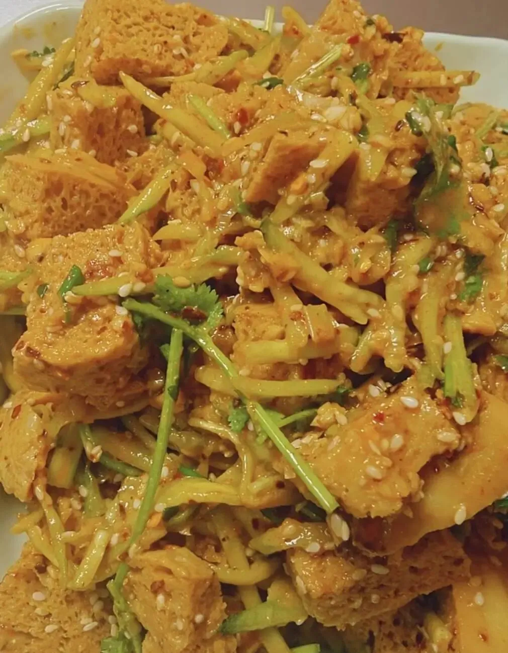 清脆的黄瓜丝、提香的香菜、点睛的小米辣。拌匀了,面筋块裹着厚厚的酱汁,每一口都爆浆。一口面筋,一口脆菜,解腻又爽口,完美中和麻酱的厚重。
