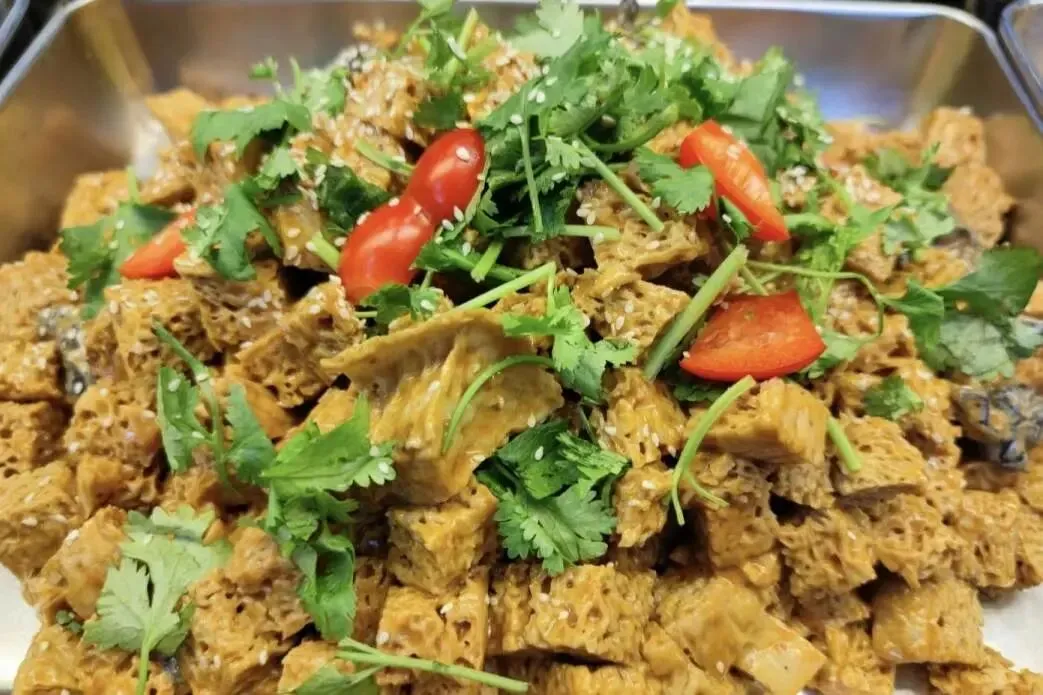 街边的小馆子里,凉菜柜里永远有一盆拌好的面筋,用保鲜膜盖着,有人点就夹一盘。夜市摊上,老板现点现拌,面筋块在盆里颠几下,酱汁挂得均匀透亮。就连按斤称的自选凉菜摊,面筋也是抢手货——几块钱就能夹一塑料袋,回家配馒头吃。