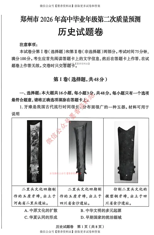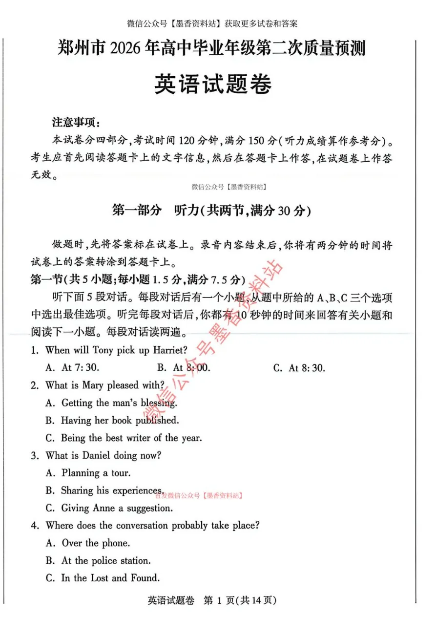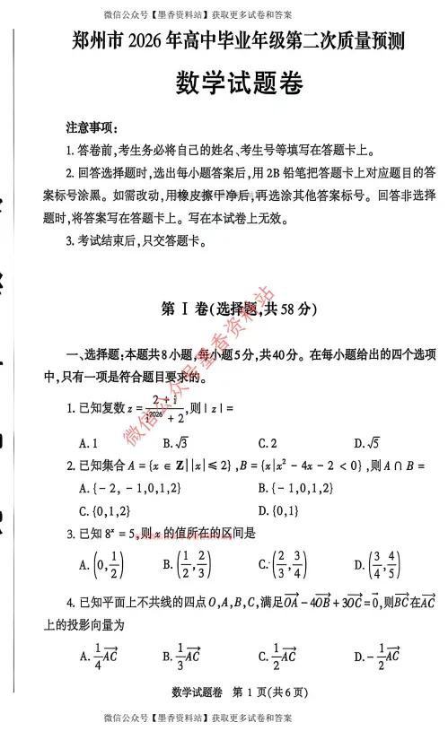 河南省郑州市2026年高中毕业年级第二次质量预测(郑州二模)全科试卷含答案(由于部分科目未考,所以暂未更新,考后更新)