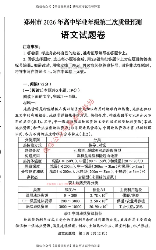 搬无法实现快速发展。(每答出一点给2分。意思答对即可。如有其他答案,只要言之成理,可酌给分。)5.(6分)①材料一兼用说明性文字和表格,对地热资源进行了科普,数据直观、图表清晰,科学专业:②)材料二以信息图的形式模块化解读国家的政策规划发展蓝图,重点突出,生动直观;③材料三通过问答/访谈,介绍我国深层地热开发的核心问题,针对性强,且口语化表达使专业知识通俗易懂。