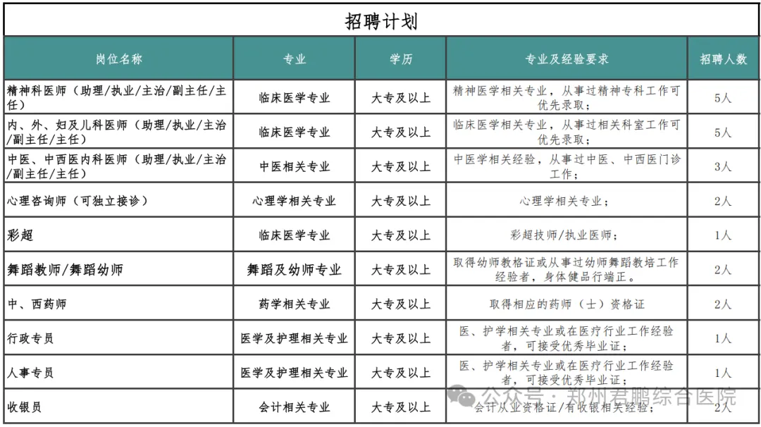 >郑州君鹏综合医院,招聘公告(护理可报)