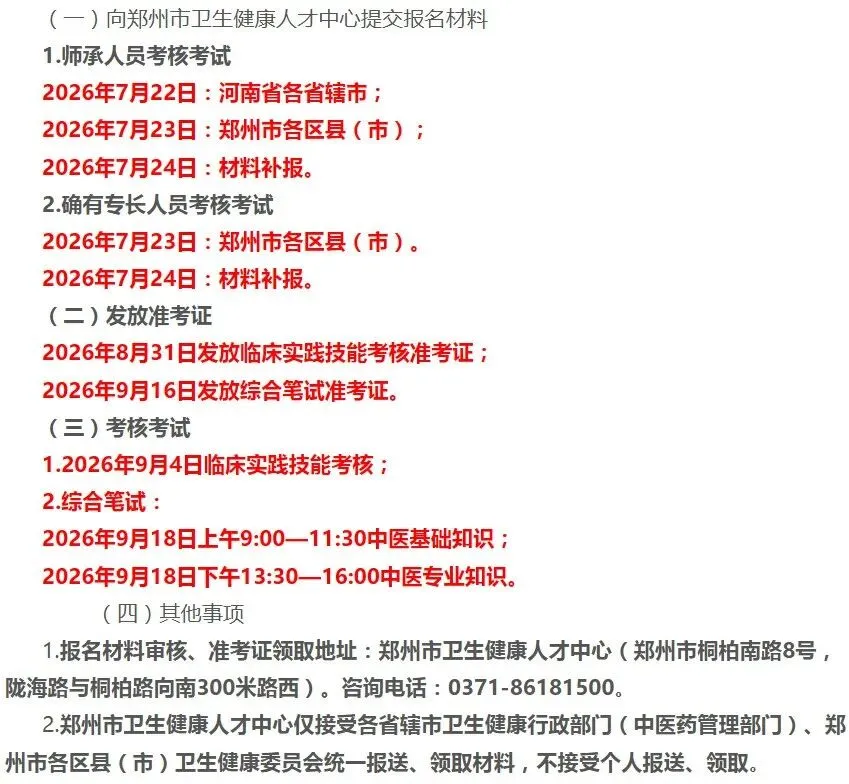 按照《郑州市卫健委等5部门关于调整郑州市医学人才考试工作领导小组的通知》(郑卫〔2023〕67号)要求,郑州市医学人才考试工作领导小组负责2026年度中医师承和确有专长人员考核考试工作。