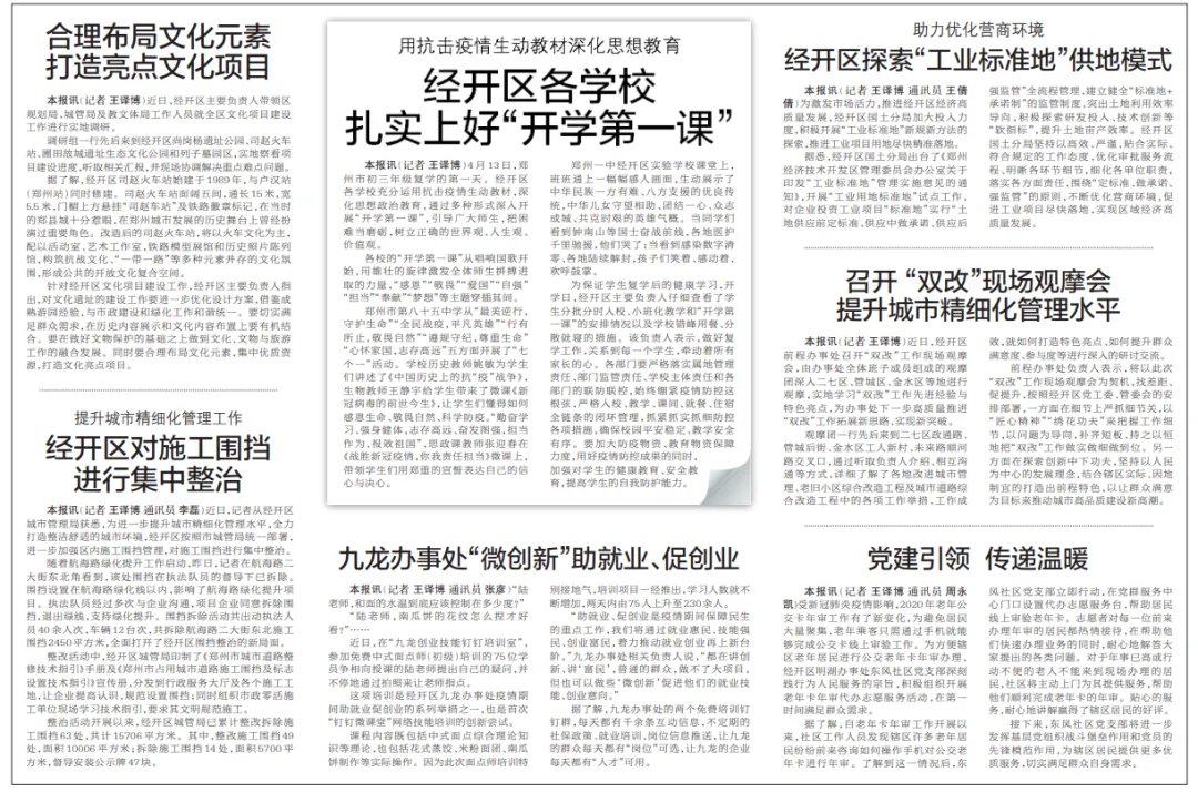 4月13日,郑州市初三年级复学的第一天。经开区各学校充分运用抗击疫情生动教材,深化思想政治教育,通过多种形式深入开展“开学第一课”,引导广大师生,把困难当磨砺,树立正确的世界观、人生观、价值观。各校的“开学第一课”从唱响国歌开始,用雄壮的旋律激发全体师生拼搏进取的力量,“感恩”“敬畏”“爱国”“自强”“担当”“奉献”“梦想”等主题穿插其间。郑州市第八十五中学从“最美逆行,守护生命”“全民战疫,平凡英雄”“行有所止,敬畏自然”“遵规守纪,尊重生命”“心怀家国,志存高远”五方面开展了“七个一”活动。学校历史教师姚敏为学生们讲述了《中国历史上的抗“疫”战争》,生物教师王静宇给学生带来了微课《新冠病毒的前世今生》,让学生们懂得如何感恩生命、敬畏自然、科学防疫。“勤奋学习、强身健体,志存高远、奋发图强,担当作为、报效祖国”,思政课教师张迎春在《战胜新冠疫情,你我责任担当》微课上,带领学生们用郑重的宣誓表达自己的信心与决心。郑州一中经开区实验学校课堂上,通上一幅幅感人画面,生动展示了中华民族一方有难、八方支援的优良传统,中华儿女守望相助、团结一心、众志成城、共克时艰的英雄气概。当同学们看到钟南山等国士奋战前线,各地医护千里驰援,他们哭了;当看到感染数字清零、各地陆续解封,孩子们笑着、感动着、欢呼鼓掌。为保证学生复学后的健康学习,开学日,经开区主要负责人仔细查看了学生分批分时入校、小班化教学和“开学第一课”的安排情况以及学校错峰用餐、分散就寝的措施。该负责人表示,做好复学工作,关系到每一个学生,牵动着所有家长的心。各部门要严格落实属地管理责任、部门监管责任、学校主体责任和各部门的联防联控,始终绷紧疫情防控这根弦,严格入校、教学、课间、就餐、住宿全链条的闭环管理,抓紧抓实抓细防控各项措施,确保校园平安稳定、教学安全有序。要加大防疫物资、教育物资保障力度,用好疫情防控成果的同时,加强对学生的健康教育、安全教育,提高学生的自我防护能力。受新冠肺炎疫情影响,2020年老年公交卡年审工作有了新变化,为避免居民大量聚集,老年乘客只需通过手机就能够完成公交卡线上审验工作。为方便辖区老年居民进行公交老年卡年审办理,经开区明湖办事处东风社区党支部深刻践行为人民服务的宗旨,积极组织开展老年卡年审代办志愿服务活动,在第一时间满足群众需求。