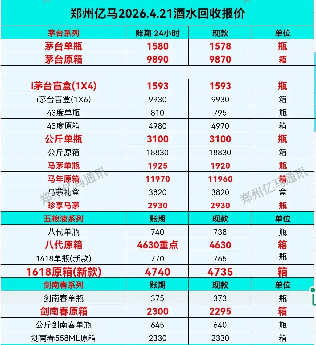 >郑州亿马4月21日酒水报价
