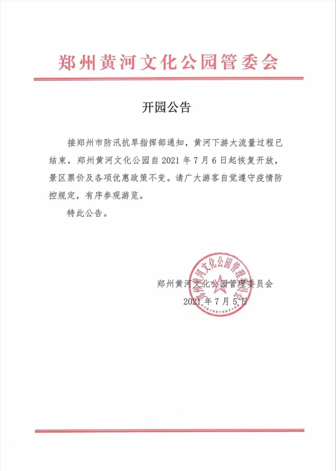 接郑州市防汛抗旱指挥部通知,黄河下游大流量过程已结束,郑州黄河文化公园自2021年7月6日起恢复开放,景区票价及各项优惠政策不变。请广大游客自觉遵守疫情防控规定,有序参观游览。