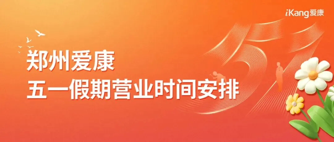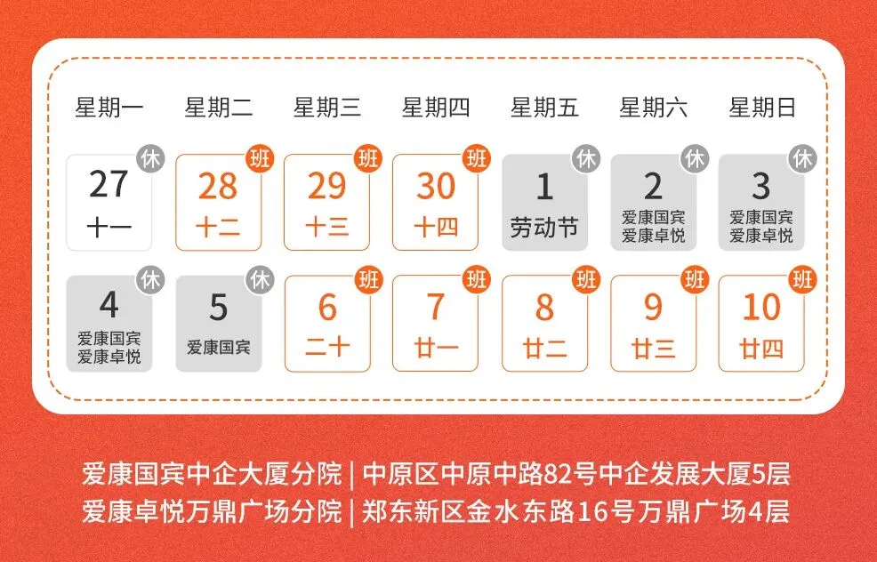 为确保您在小长假期间(5月1日至5日)依然能够享受到便捷、优质的服务,郑州爱康特将假期两家分院(含健康体检、齿科、门诊)休息及营业时间公示如下: