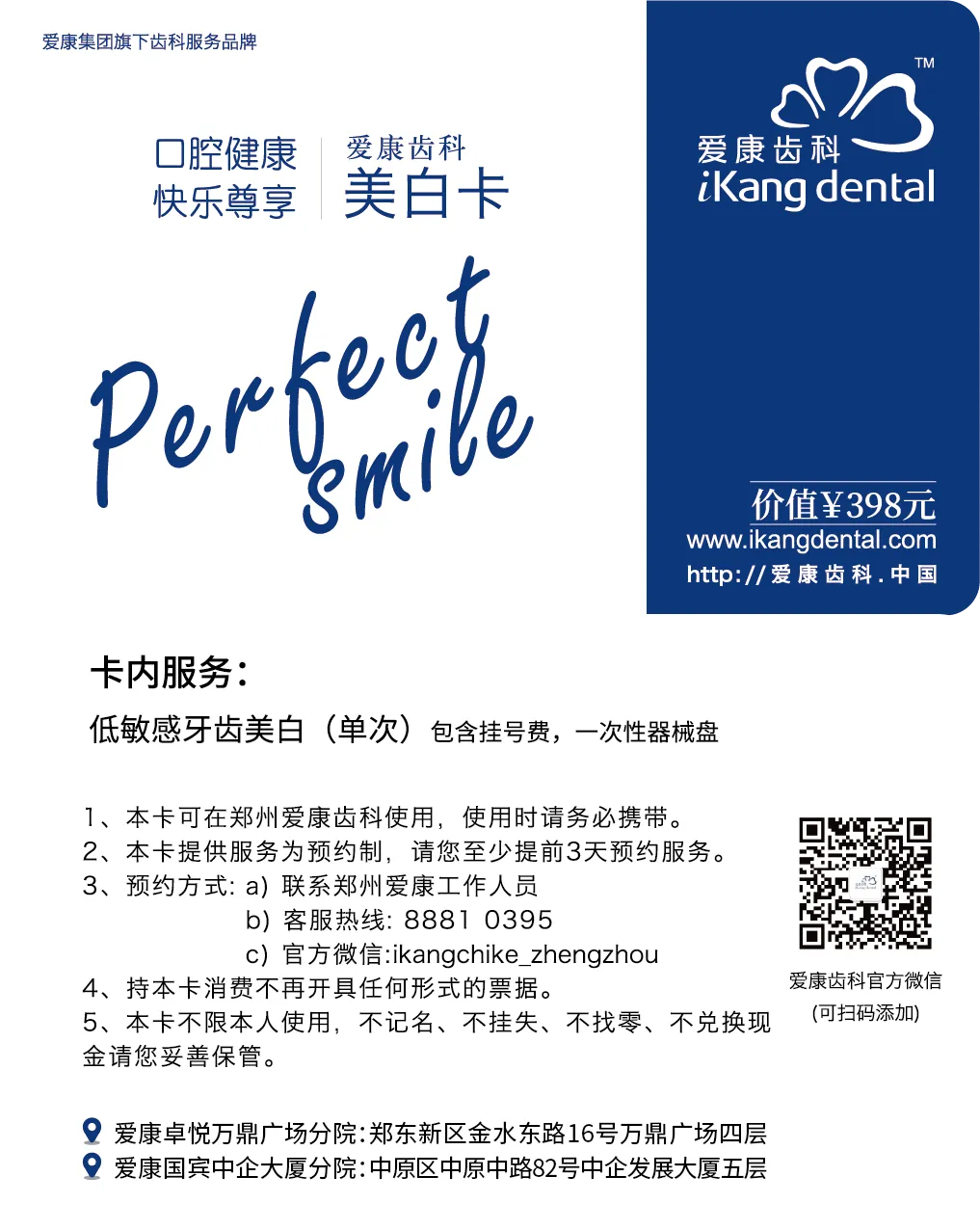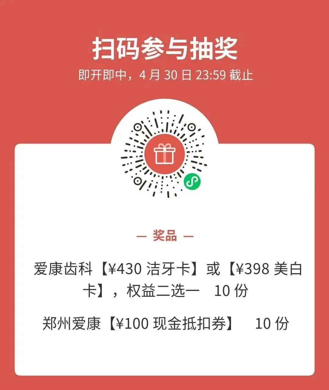一等奖:爱康齿科【¥430 洁牙卡】1张 或【¥398 美白卡】1张 ,权益二选一。
