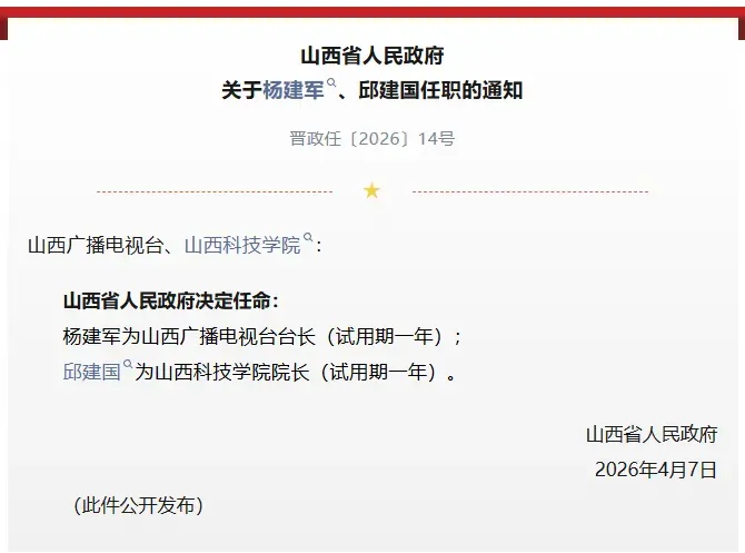 今年4月,山西省人民政府发布任职通知,其中:任命杨建军为山西广播电视台台长(试用期一年)。公开资料显示,杨建军,男,汉族,1968年9月出生,山西怀仁人,1990年7月参加工作,1996年4月加入中国共产党,大学学历。