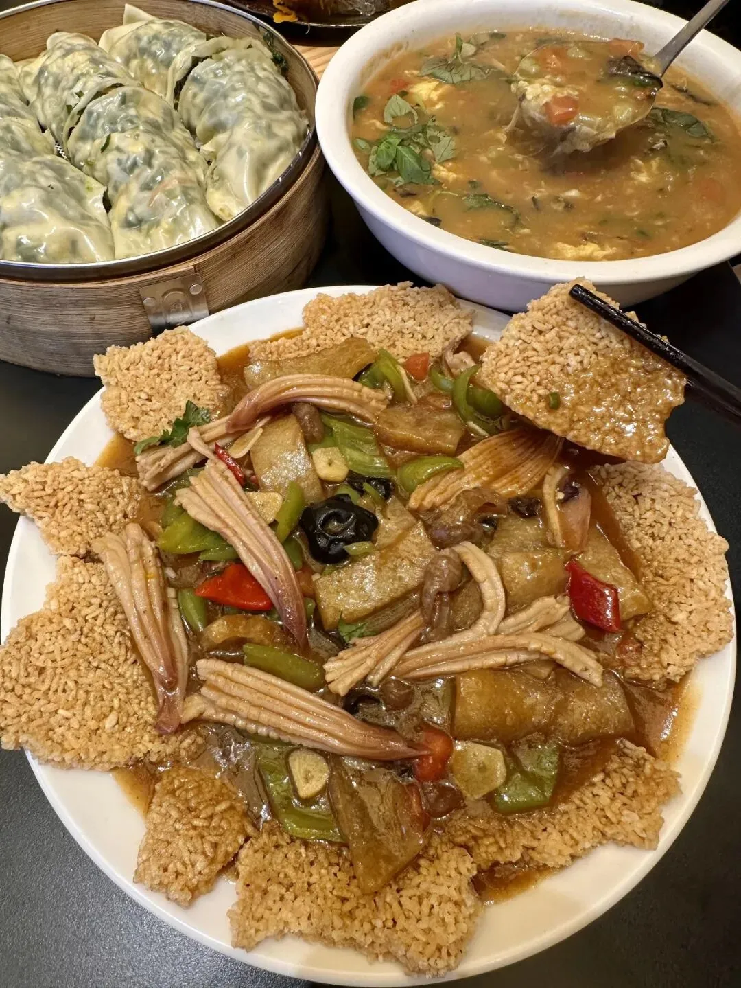 那个鱿鱼锅巴你们一定要点!浓稠的鱿鱼烩菜往锅巴上一浇,锅巴吸满了亮堂堂的酱汁,夹一块咬下去,半软半脆的,鱿鱼韧弹韧弹的,酱香裹着米香,越嚼越香,我跟朋友抢着吃都。