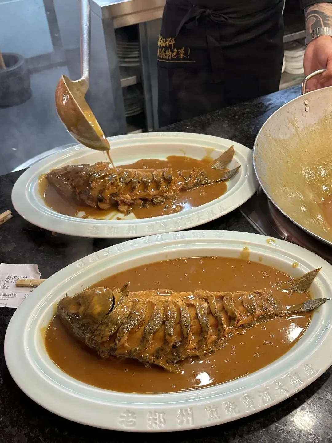 先说说这个煎烧黄河大鲤鱼,师傅现场端过来浇汁,热腾腾的酱香直往鼻子里钻,鱼炖得软透了,每一丝肉都浸满了咸香的酱汁,刺都炖得酥酥的,我这种怕刺的都能大口炫。