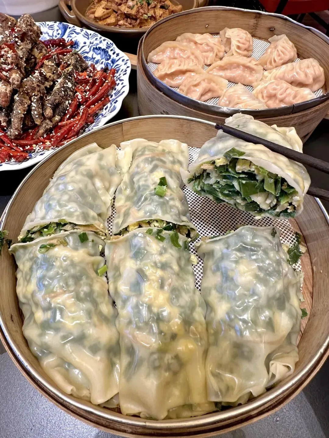还有这个菜莽!我第一次吃,薄薄的透皮,隔着都能看见里边绿盈盈的韭菜鸡蛋,咬一口皮软软黏糯的,韭菜特别清甜,鸡蛋嫩嫩的,鲜得不行,这么大一个我一口接一口,一下就吃了半个。