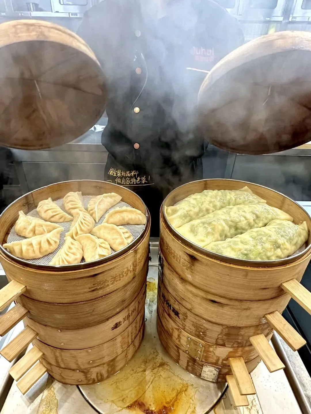 还有蒸饺,刚蒸好揭开蒸笼,冒着白白的热气,皮韧韧的,馅鲜得冒汁,一口一个停不下来。