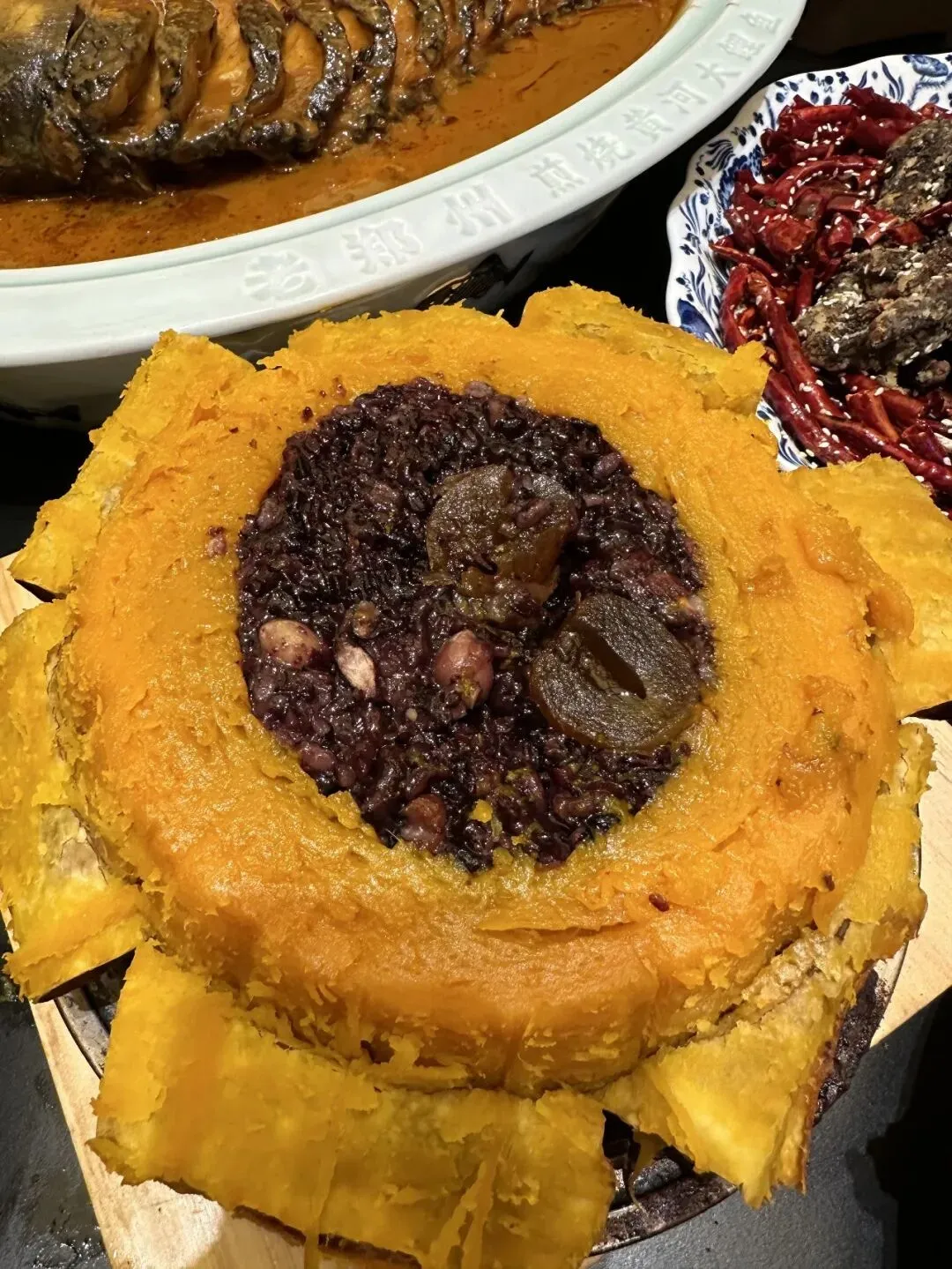 那个紫米蒸南瓜也绝,南瓜绵绵沙沙的,中间的紫米黏黏甜甜的,吃了一堆咸的,挖一口这个,整个人都舒服了。最后再来一碗宽片烩面,汤鲜得掉眉毛,宽面片滑溜溜的,牛肉块给得扎扎实实,一口汤下去暖到肚子里。