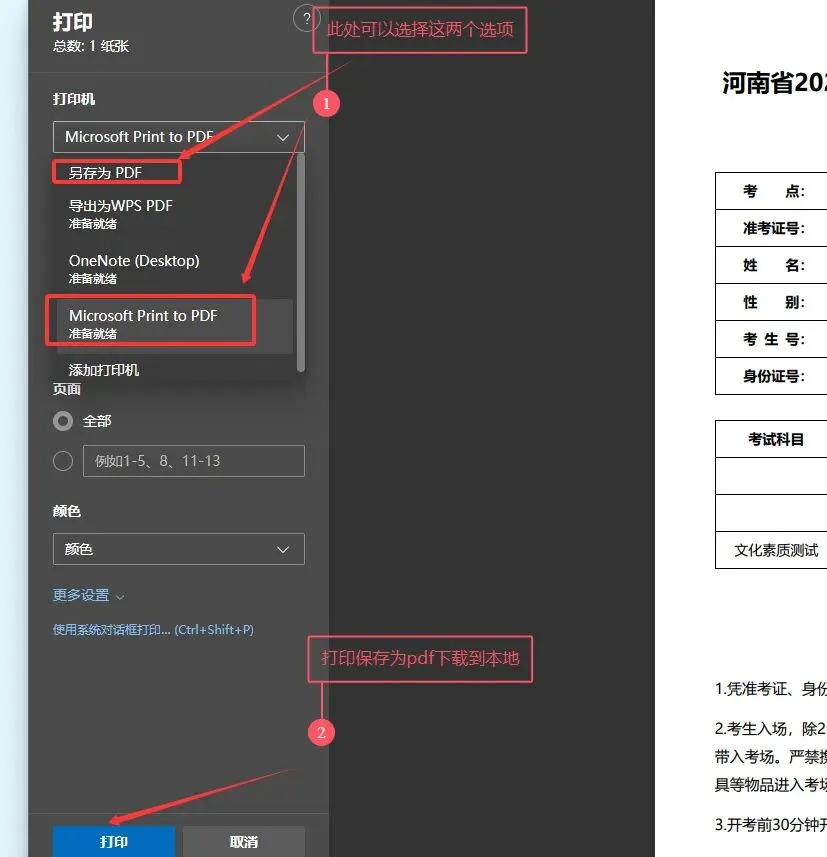 在打印机位置,可以选择【另存为PDF】或【Microsoft Print to PDF】选项,然后点击【打印】;这样准考证就用PDF形式保存到本地了;最后去打印店打印即可了。