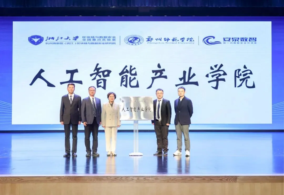 近日,郑州师范学院人工智能产业学院揭牌仪式在嵩山学堂隆重举行。浙江大学区块链与数据安全全国重点实验室暨杭州高新区(滨江)区块链与数据安全研究院、杭州安泉数智科技有限公司相关代表应邀出席。校长张铟出席活动并致辞,揭牌仪式由副校长胡明生主持。教务处相关负责人,信息学部师生代表一千余人参加活动。