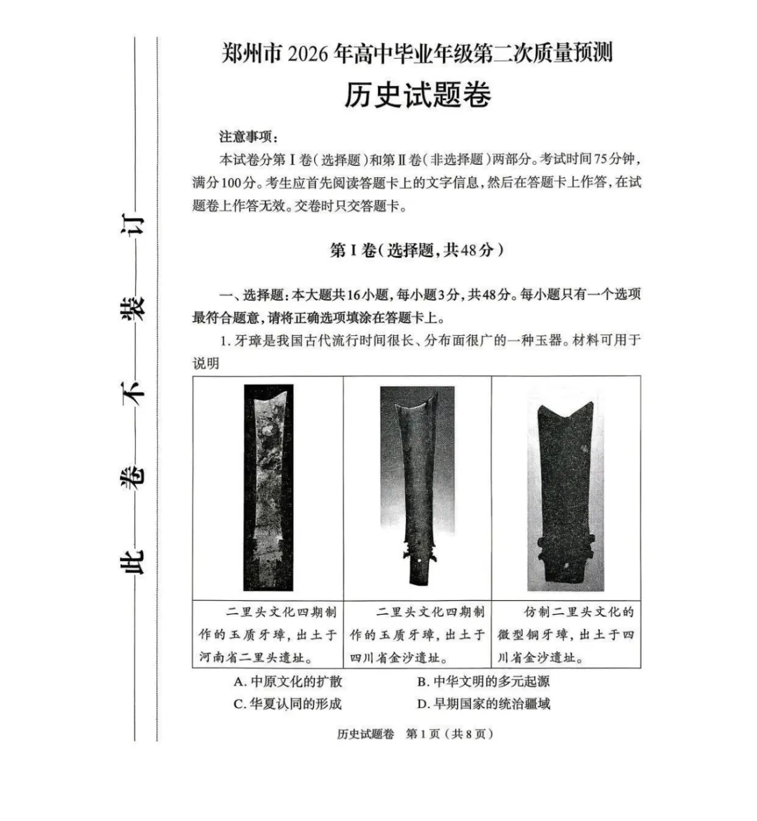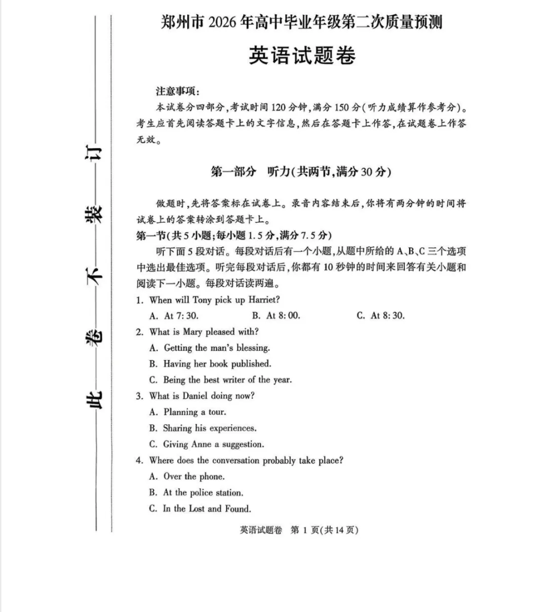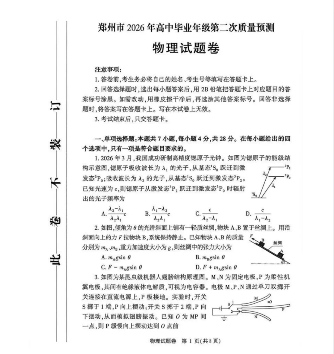 郑州二模|郑州市 2026 年高中毕业年级第二次质量预测试题