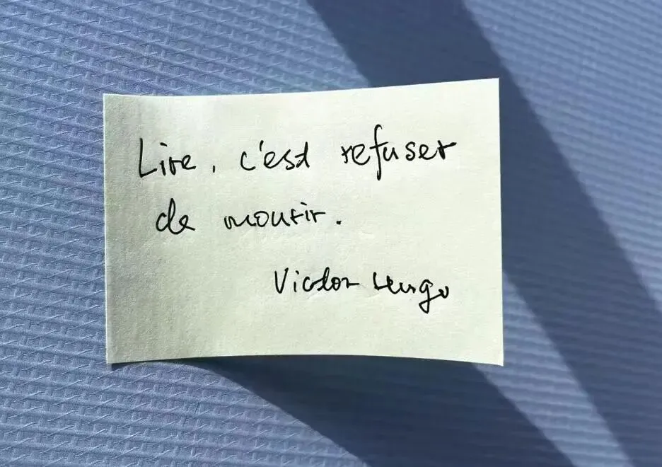 许多挑战成功的人,把感受写在小纸条上,贴成了一面“心灵墙”。其中一位外国友人的留言引起了大家的好奇,经查询是法国文豪雨果的名句:“阅读是对死亡的反抗。”(Lire, c'est refuser de mourir.)