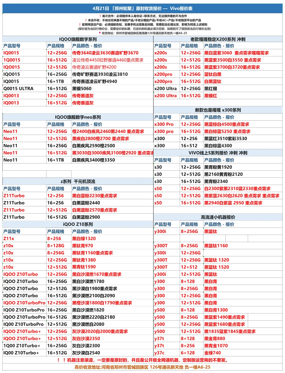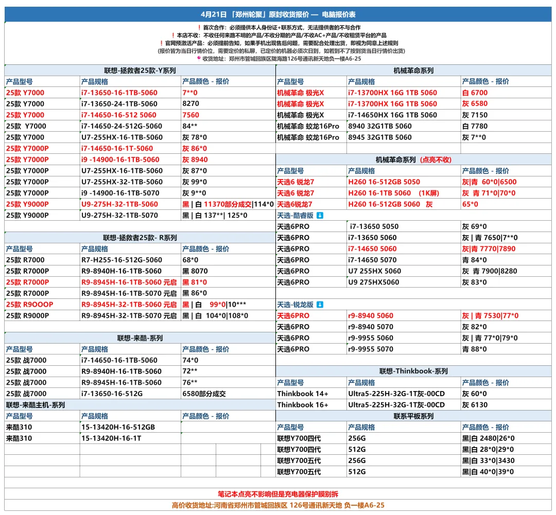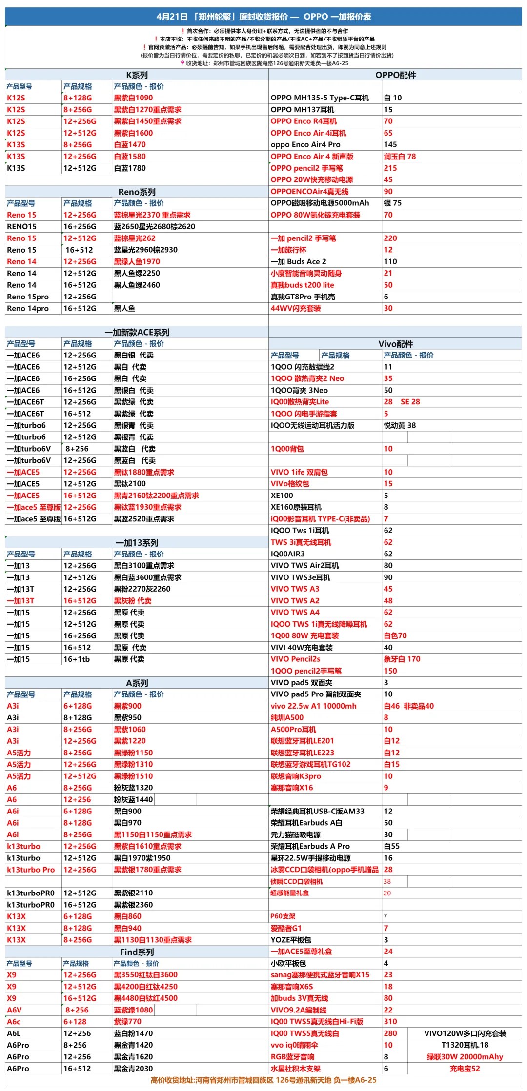 >郑州通讯新天地轮聚通讯 2026年4.21日数码报价更新