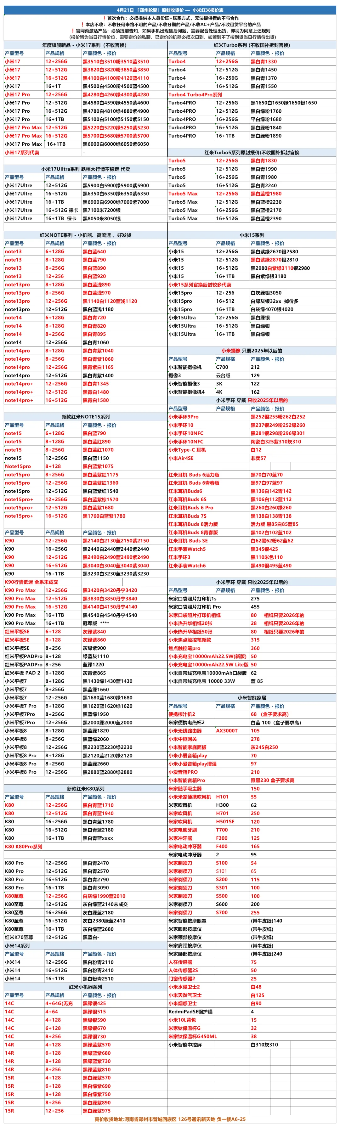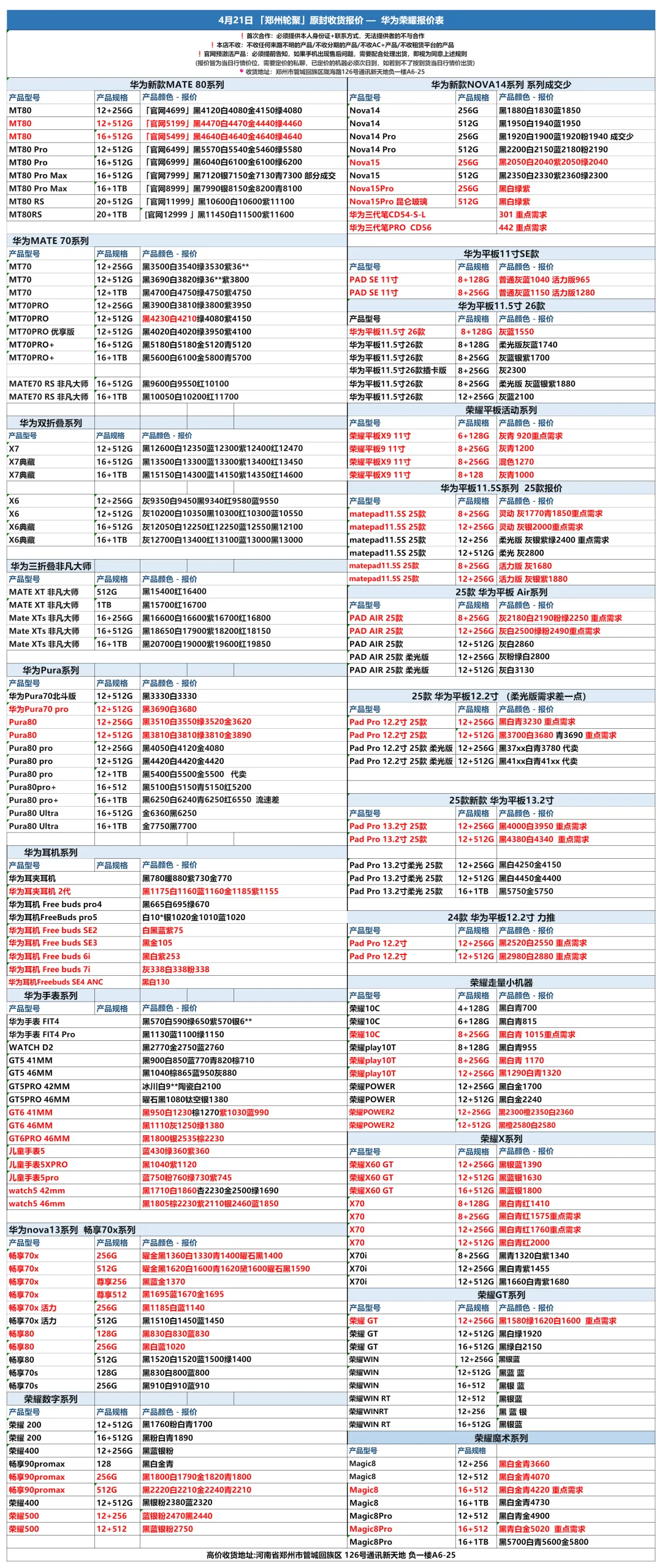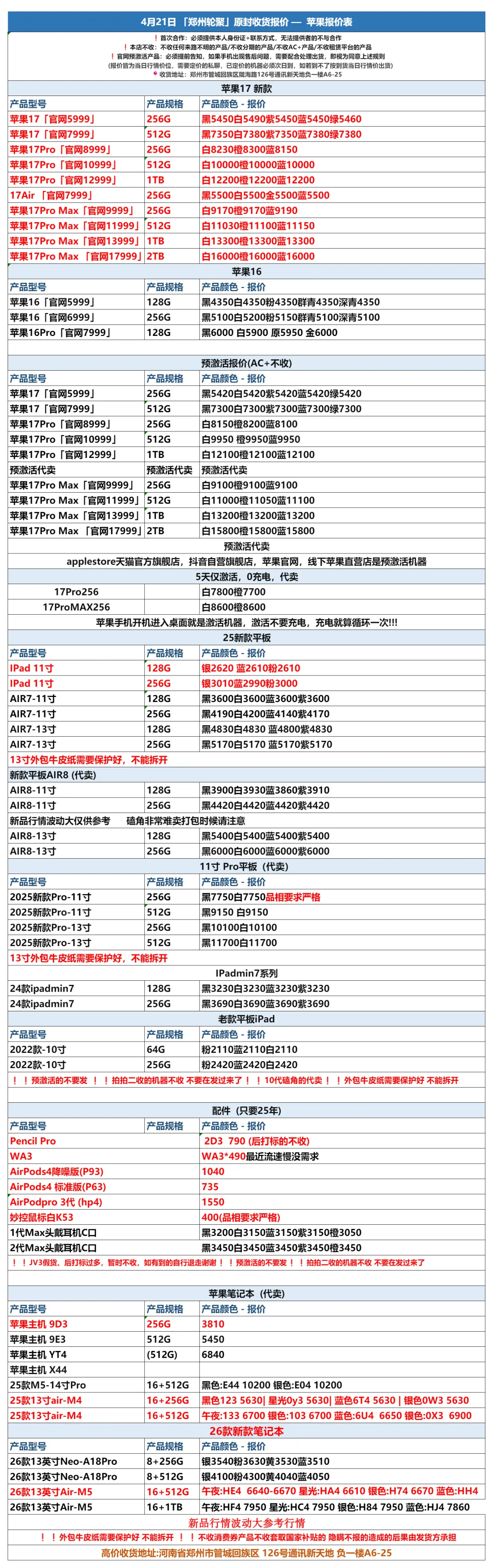 郑州通讯新天地轮聚通讯 2026年4.21日数码报价更新