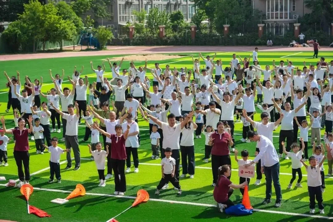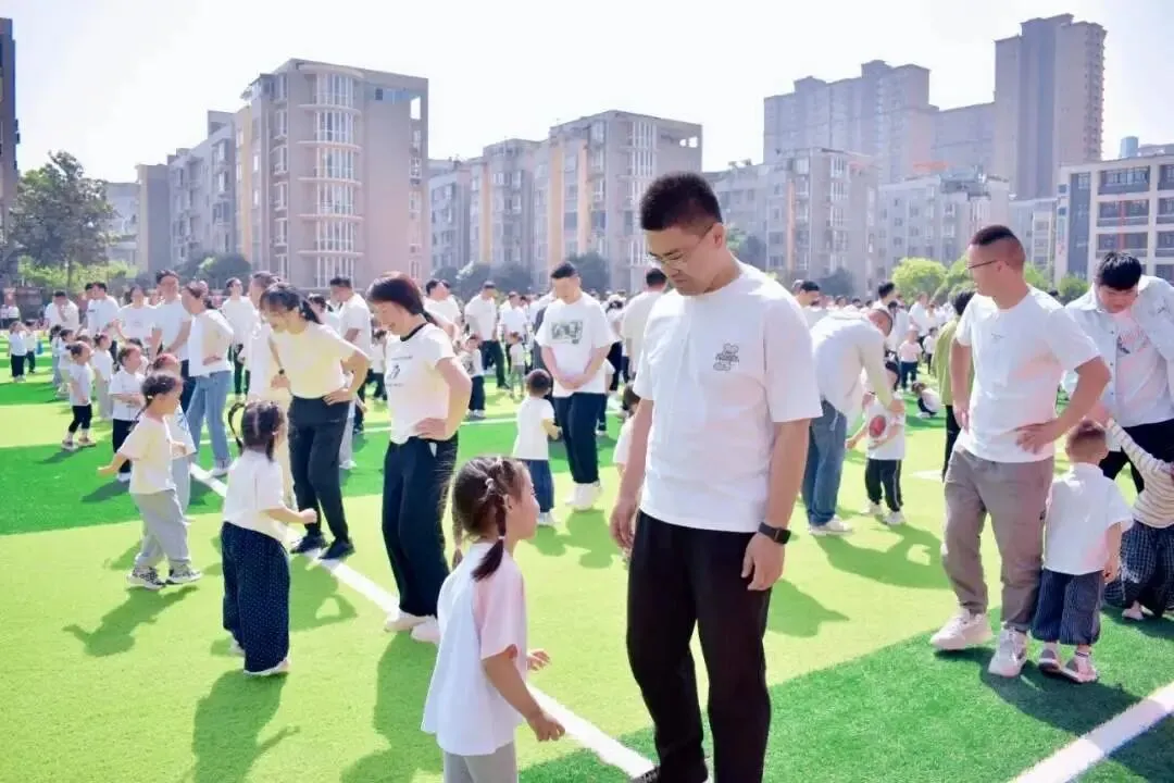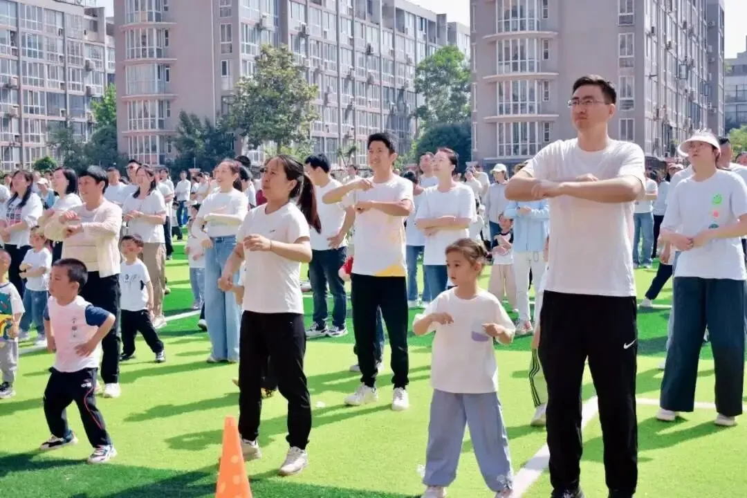 当《快乐甜甜圈》音乐响起,家长们跟着孩子一起扭动身体、拍手转圈,操场上瞬间变成了欢乐的律动海洋。