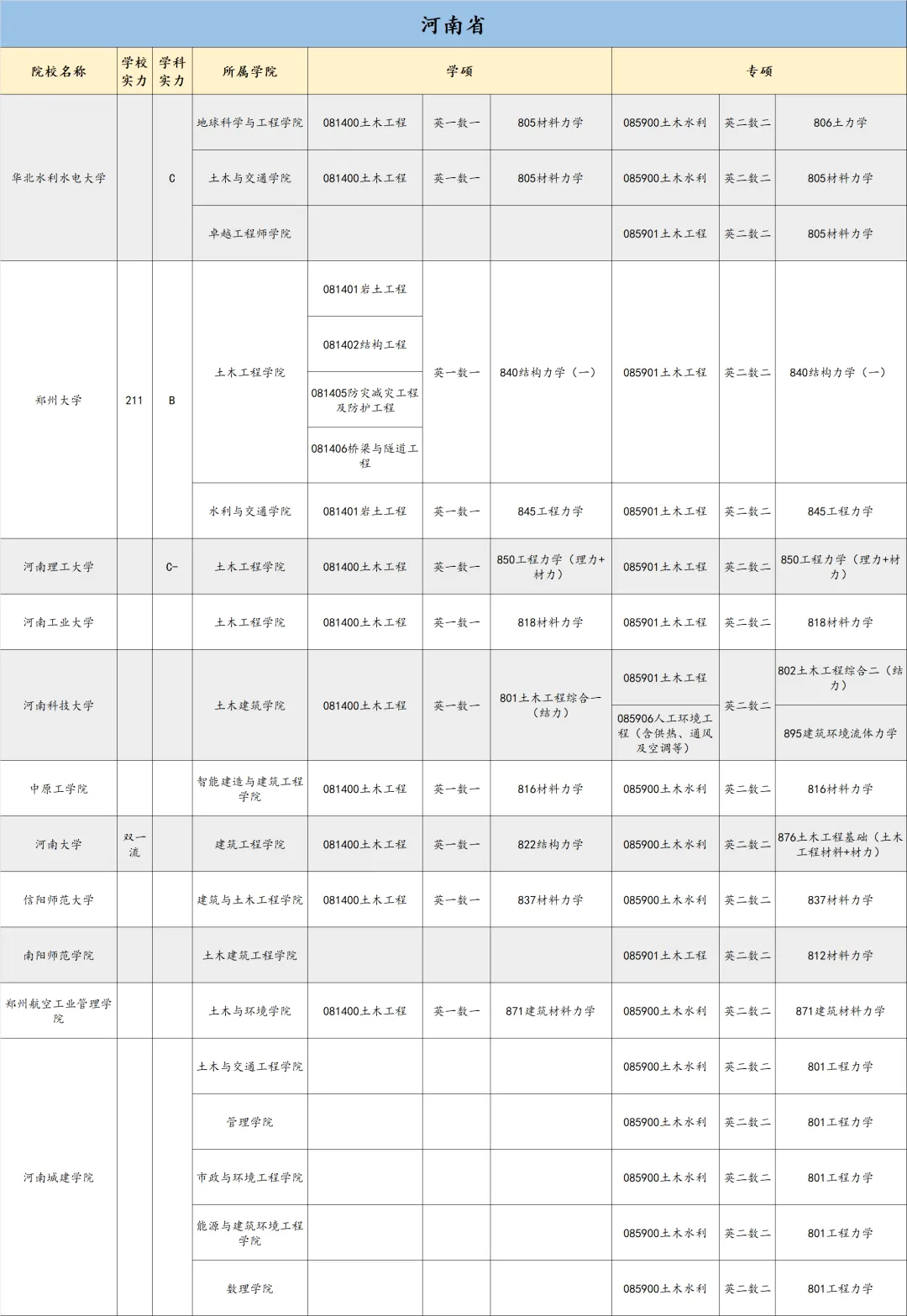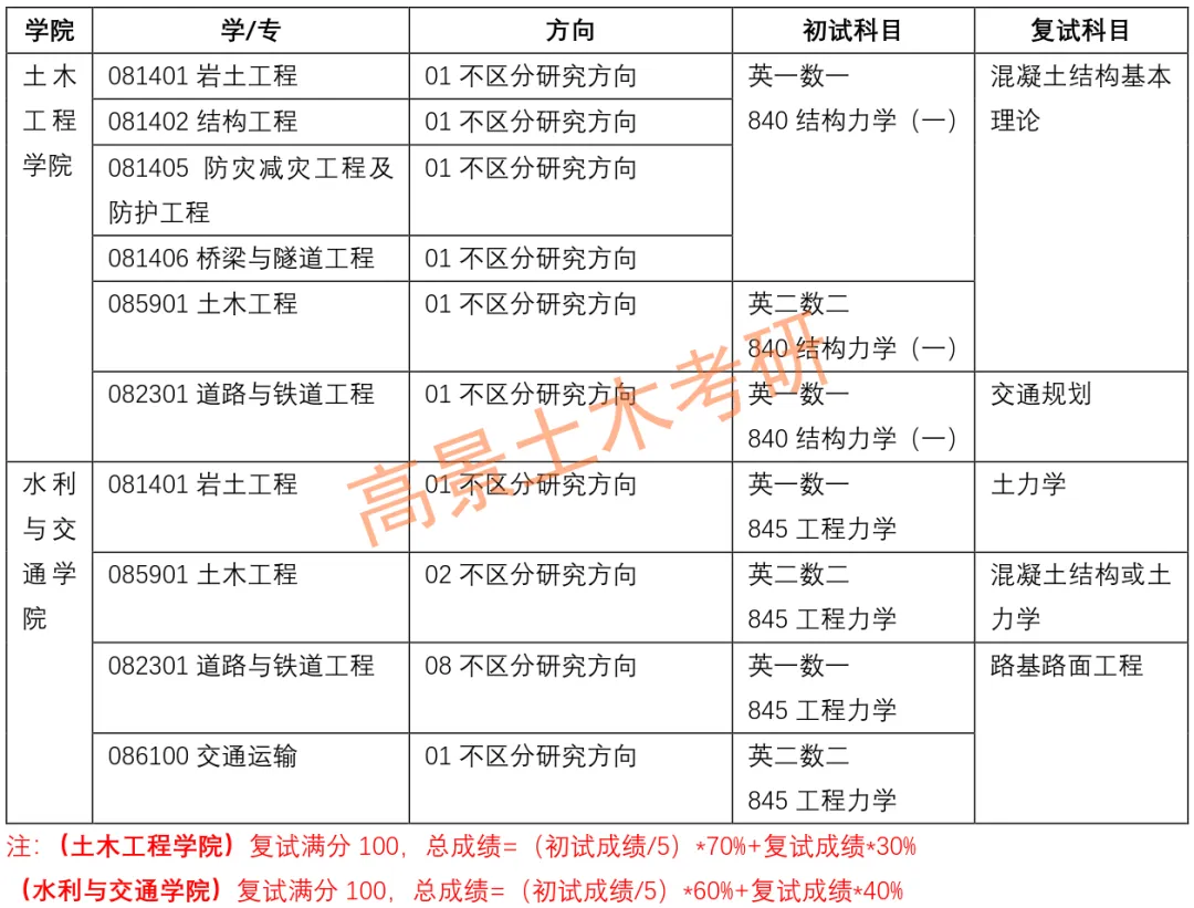 郑州大学土木与水利学院均招收土木硕士。详细初复试科目如下: