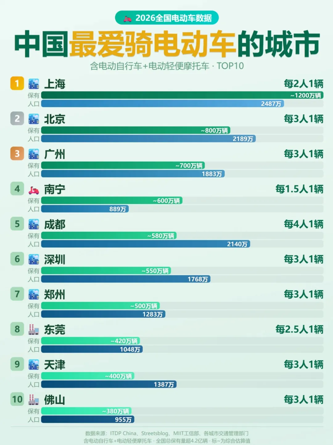 近日,规划城建群流传一组2026年全国电动车保有量排行榜,尽管数据为综合估值,但均有明确数据来源,具备较高可信度。榜单显示,上海以约1200万辆的保有量位居全国第一,郑州则以保有500万辆的规模跻身第七,紧跟北上广深等一线城市步伐,成为中部地区电动车保有量领先的城市。如今,电动自行车早已成为郑州人日常出行的“刚需代步工具”,其便捷性适配短距离出行场景,不管是上班族通勤、老年人接送孩子、采购物资,都能灵活穿梭,有效填补了公共交通“最后一公里”的缺口。据官方相关统计,郑州电动自行车保有量近年来稳步攀升,目前已接近500万辆,相当于每3个郑州人就拥有1辆,足以看出其普及度与实用性。值得一提的是,随着2026年全国范围内取消合规电动车“一刀切”禁行政策,规范骑行的重要性愈发凸显。事实上,合规电动自行车不仅便捷民生,更能为大城市交通“减负”——其体积小巧、通行灵活,可有效分流短途客流,减少机动车路面占用,缓解交通拥堵,同时践行绿色低碳出行理念,对城市交通有序发展、生态环境改善都有着积极意义,堪称城市交通的“毛细血管”。 消息来源:郑州发声
