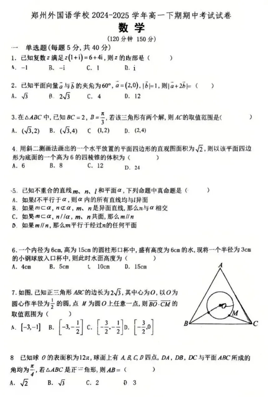 河南省郑州外国语学校2024-2025学年高一下学期期中数学试卷及答案