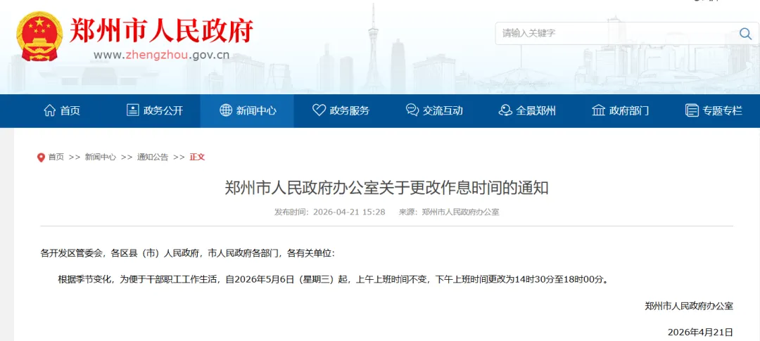 根据季节变化,为便于干部职工工作生活,自2026年5月6日(星期三)起,上午上班时间不变,下午上班时间更改为14时30分至18时00分。