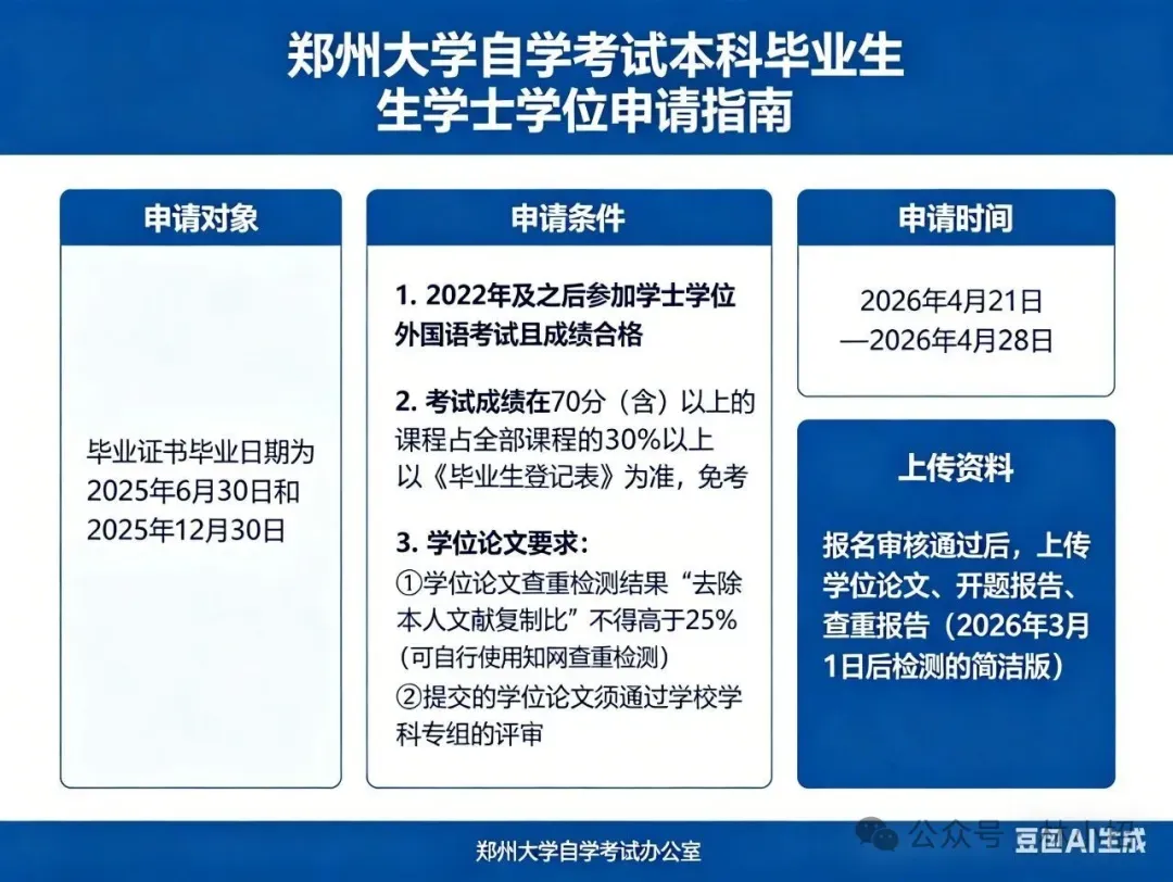 为做好郑州大学高等教育自学考试本科毕业生学士学位申请工作,现将具体事项通知如下: