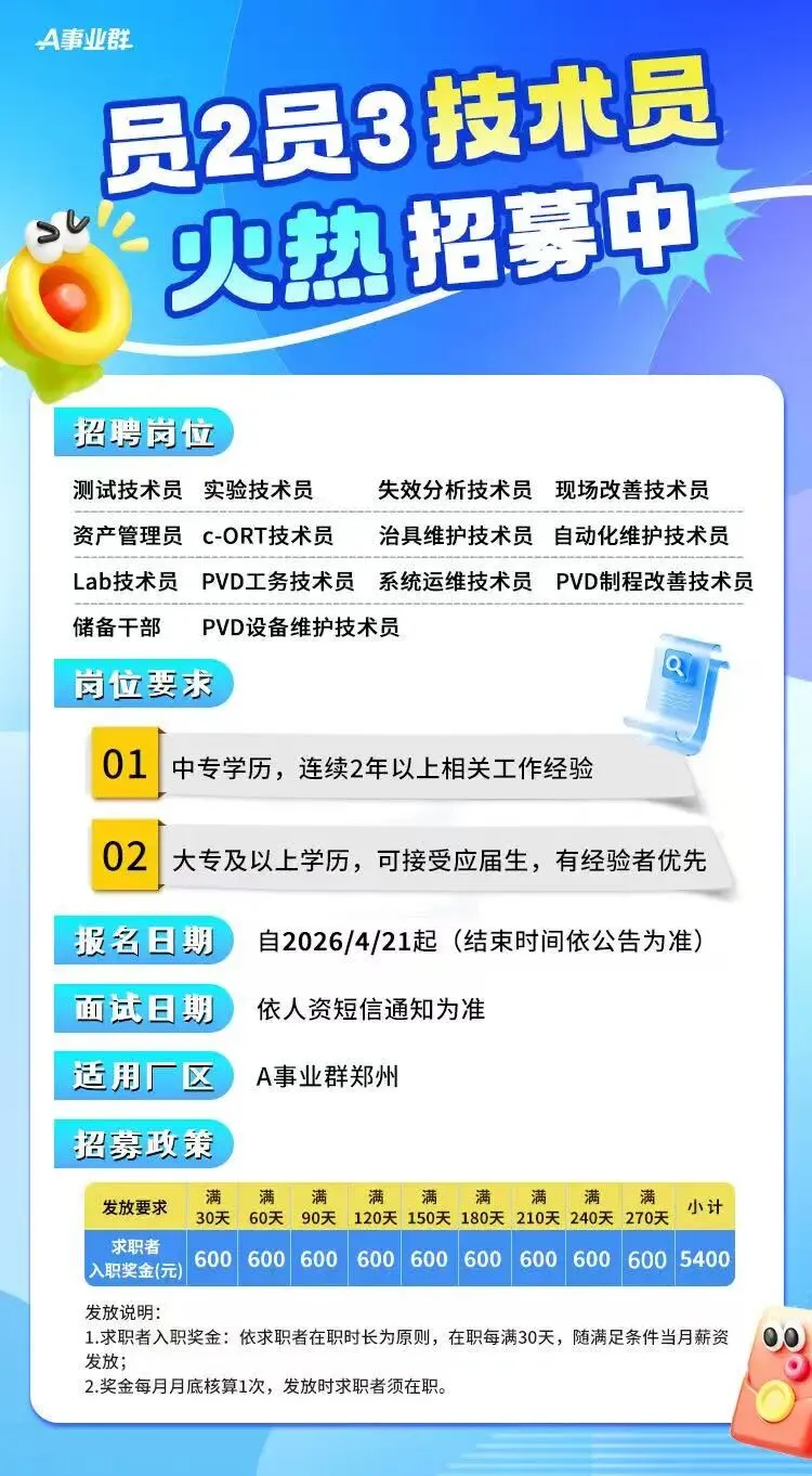 郑州富士康员二员三技术工开启招募